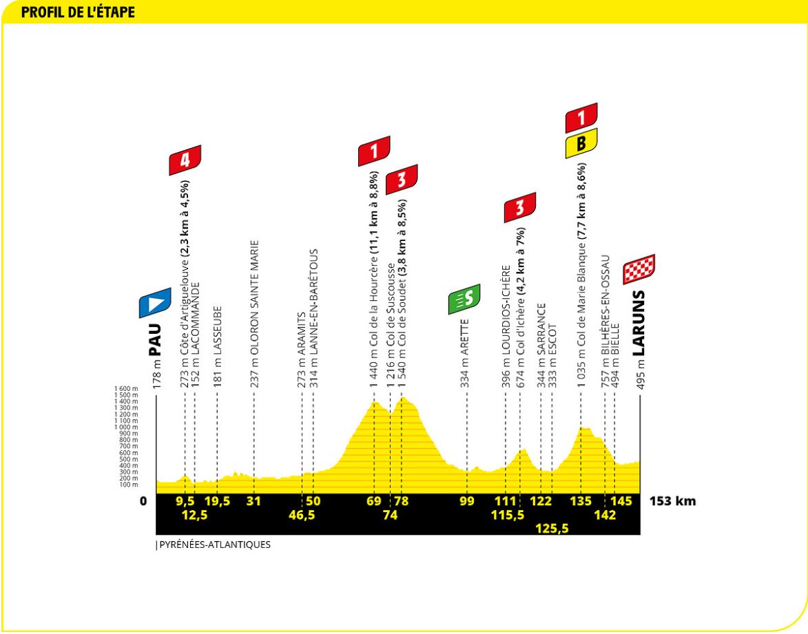 ピレネー山岳ステージ2日目となる第9ステージは、5つのカテゴリー山岳が登場。スタートからわずか9.5kmで4級山岳アルティーグルヴ峠(距離2.3km、平均勾配4.5%)が現れ、しばらく平坦基調のコースを進んだあと、およそ70km地点に1級山岳ラ・ウルセル峠(距離11.1km、平均勾配8.8%)、続いて3級山岳スデ峠(距離3.8km、平均勾配8.5%)とカテゴリー山岳が連続。スプリントポイントを経て3級山岳イシェール峠(距離4.2km、平均勾配7%)、最後にボーナスポイントのかかった1級山岳マリーブランク峠(距離7.7km、平均勾配8.6%)を越えてフィニッシュとなる。