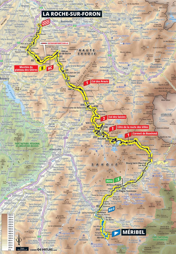 続く超級山岳プラトー・デ・グリエール(距離6km、平均勾配11.2%)の上りでビルバオが集団から遅れ、逃げグループはイネオス勢の2人のみとなった。ボーナスポイントのかかるこの山岳もカラパスが先頭通過し、山岳賞のポイント争いでトップに躍り出た。カラパスとクフィアトコフスキはこの後の未舗装区間もクリアし、2人でフィニッシュ地点まで逃げ切りを目指した。