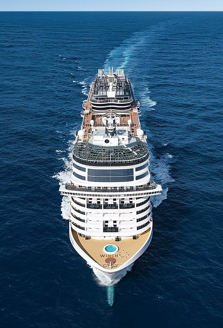 本来航史上最大の 17 万トン 客船 MSCベリッシマは、〈MIGHTY CROWN〉地元横浜のランドマークタワーに匹敵する大きさでその船上で毎日音楽に囲まれて過ごす 5 泊の旅が体験できる。