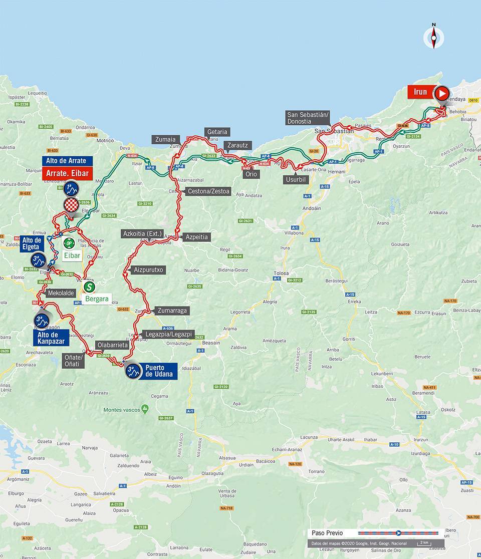 レースは176人がバスク地方のイルンからスタート。バスク特有のアップダウンの続くコースだ。序盤から激しい展開でレミ・カヴァニャ(ドゥクーニンク・クイックステップ)とカンタン・ジョレギ(AG2Rラモンディアル)の2人のフランス人が逃げ出し。ヤシャ・ズッタリン(サンウェブ)、(ロロット・スーダル)、イェツセ・ボル(ブルゴスBH)が加わり、その日のブレイクアウェイを形成する。