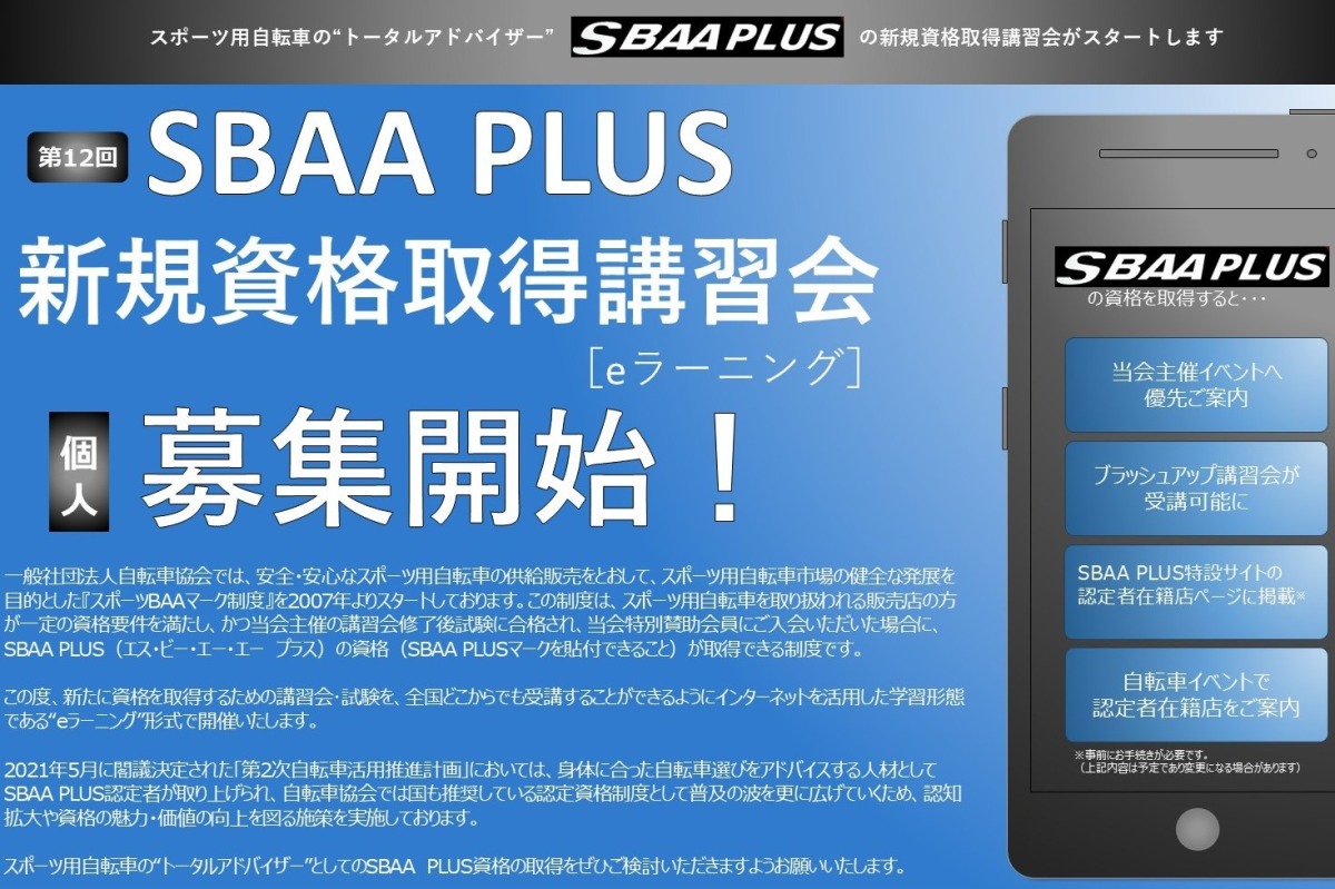 本制度は、スポーツ用自転車を取り扱われる販売店の方が一定の資格要件を満たし、かつ当会主催の講習会修了後試験に合格し、当会特別賛助会員に入会した場合に、SBAA PLUSの資格(SBAA PLUSマークを貼付できること)が取得できる制度。スポーツ用自転車の安全な利用方法を消費者に正しく理解し、その楽しみを伝える担い手となる人材にとって必要な資格となる。