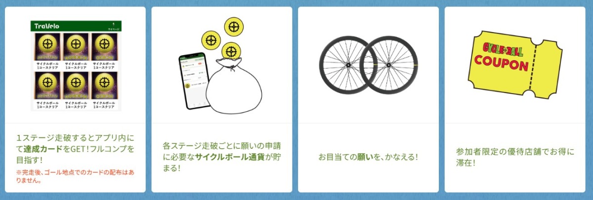 「サイクルボール」は、専用のサイクリングアプリ「TraVelo(トラベロ)」を使用して参加する期間型の無料イベント。参加者は、日本各地に設定された風光明媚な16のサイクリングコース(ステージ)に挑戦し、完走することで「サイクルボール」と呼ばれるデジタル記念品を獲得する。