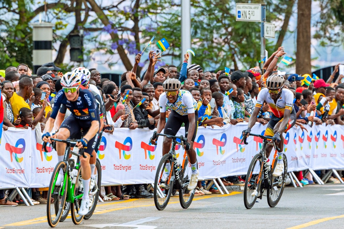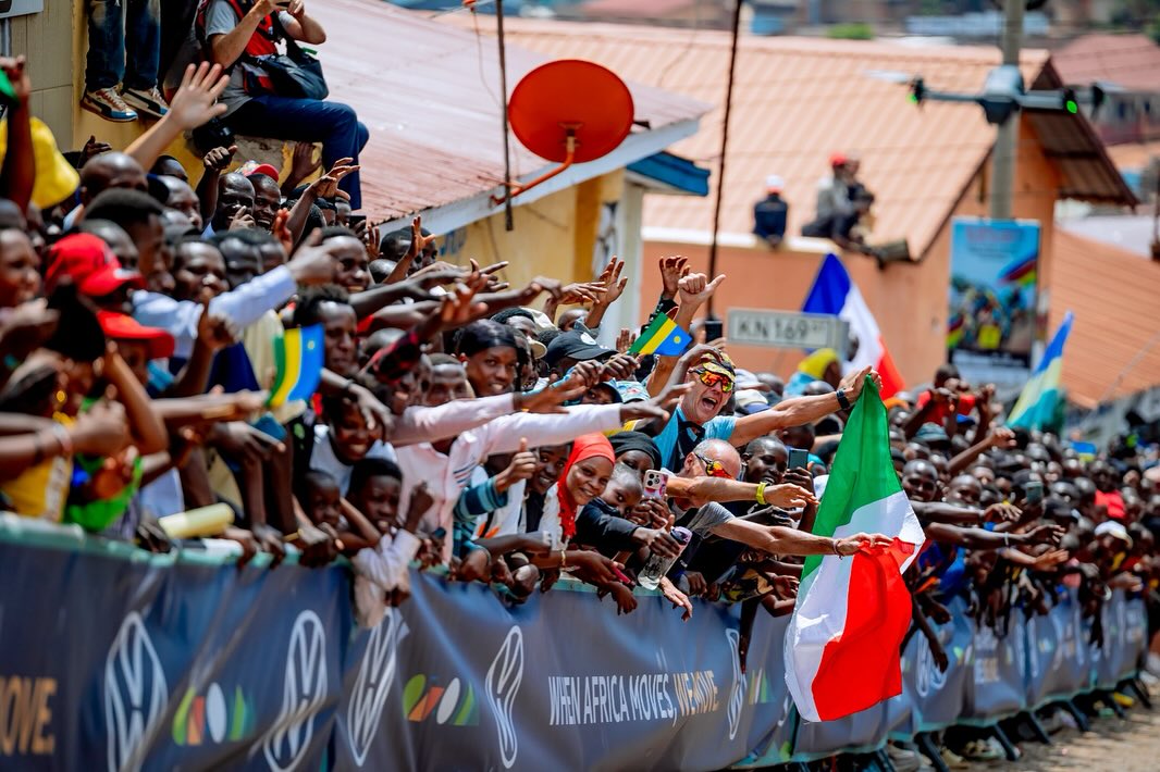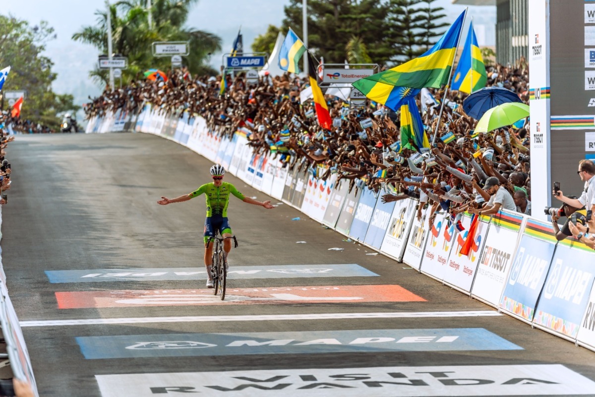 そして、ポガチャル勝利の瞬間。最終周回こそわずかに苦悶の表情を浮かべての逃げとなったが、フィニッシュまでの上りを終えると、ついに笑顔。最後の100mはウイニングライドになって、キガリのコースを征服。2年連続のマイヨ・アルカンシエル獲得を決めた。