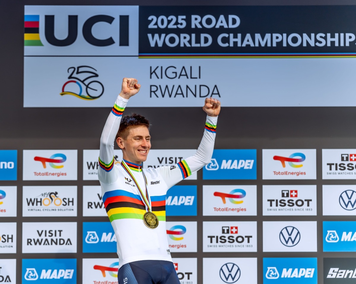 2025年シーズンのロードレース世界王者を決める、UCIロード世界選手権は9月28日に最終種目の男子エリートロードレースを実施。初のアフリカ開催としてルワンダ・キガリを舞台に行われた戦いは、タデイ・ポガチャル(スロベニア)による驚異の独走劇で大きなインパクトを残して終えることとなった。ポガチャルはフィニッシュまで104kmを残した登坂区間で攻撃に出ると、最後の66kmを独走。個人タイムトライアルを勝ったレムコ・エヴェネプール(ベルギー)らの追い上げをかわし、ロードレース2連覇を果たした。