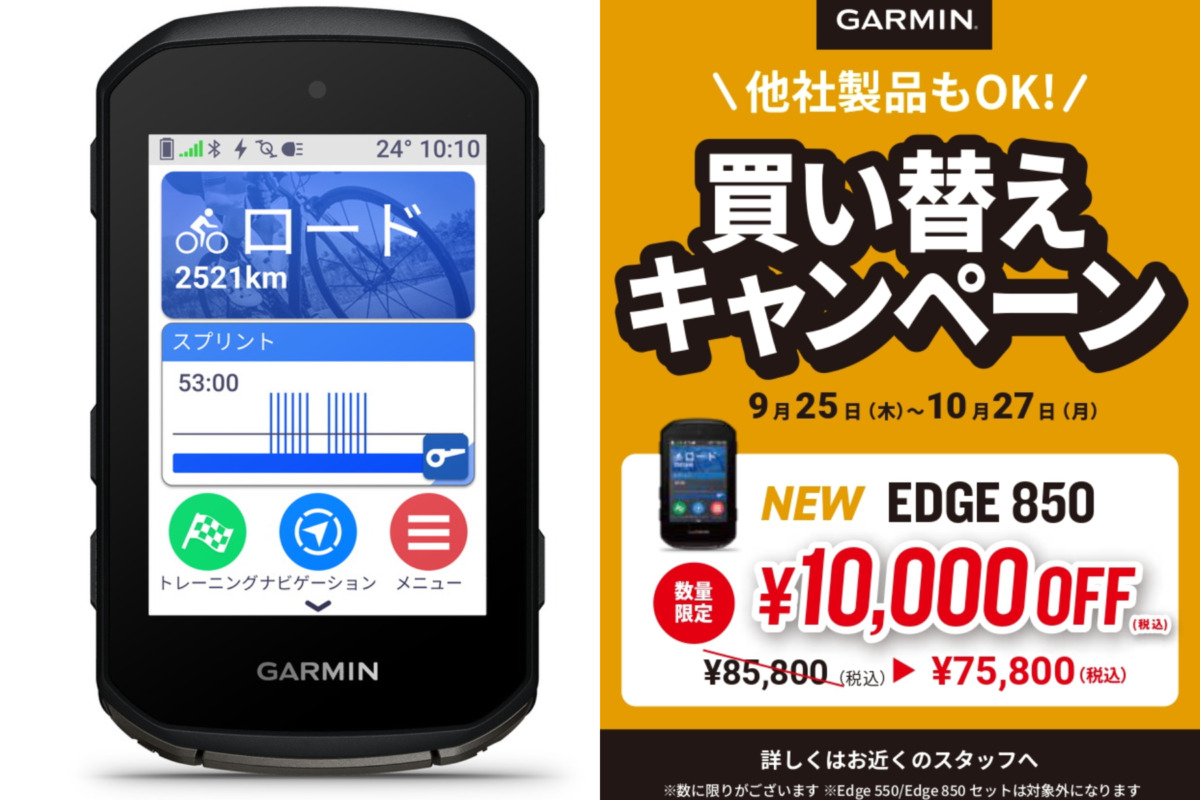 サイクルコンピュータやスマートウォッチなどを展開するGARMIN(ガーミン)が、「EDGE 850」の発売を記念して、期間限定の買い替え割引キャンペーンを実施している。手持ちの古いサイクルコンピュータからEDGE 850へ切り替えると、税込販売価格から10,000円OFFで購入可能。