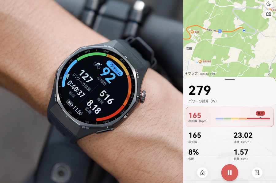 GTシリーズの歴代モデルを振り返れば、各種スポーツシーンに特化した専門機能を搭載している。例えば、ランニングやトレラン、ゴルフ、スキーなどがある。そして、サイクリング機能は以前から搭載されており、速度、距離等の基本機能はあったが、最新GT 6 Proは、よりレベルの高いサイクリング機能を搭載している。 注目はコアサイクリストにとってはお馴染みのパワー(出力)を測定できる点だ。ウォッチひとつでリアルタイムにヴァーチャルパワーを表示してくれる。専用の外付けパワーメーターを必要とせず、腕に付けた時計たったひとつで、独自のアルゴリズムにより算出する。