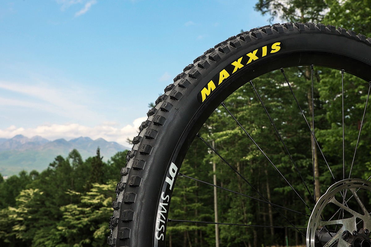 雨が降ったとき、セミウェットならHIGHROLLER。転がりも軽いんですが、ノブが高いのでバフバフのコースでもタイヤがしっかり地面をとらえてくれます。マキシスのDHタイヤは、マックスグリップコンパウンドを採用していて、非常に高いグリップを実現しています。性能を最大限に引き出すには、空気圧をシビアに管理することと、古いタイヤを使わないことも重要。トレッドゴムは鮮度が命です!