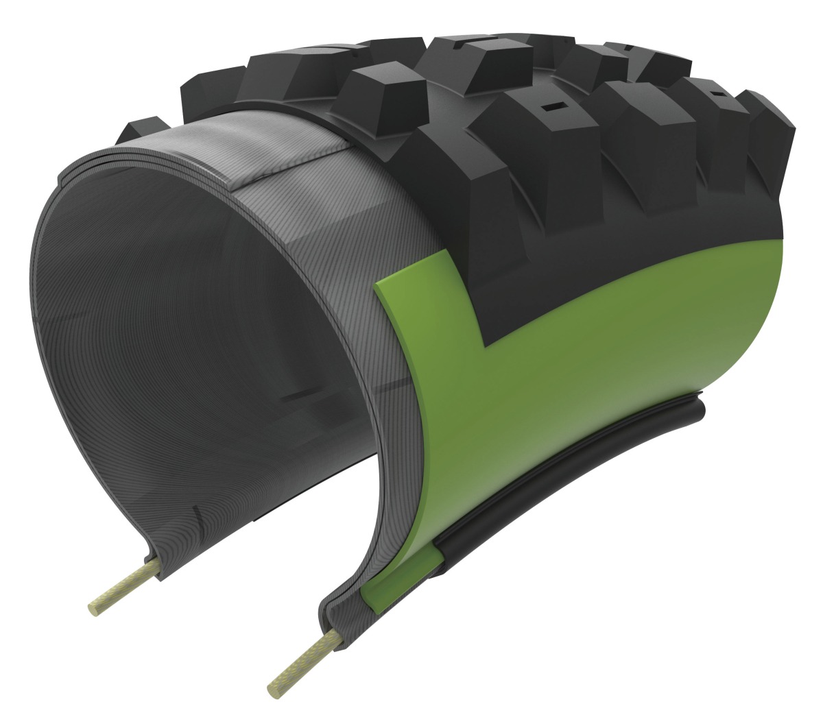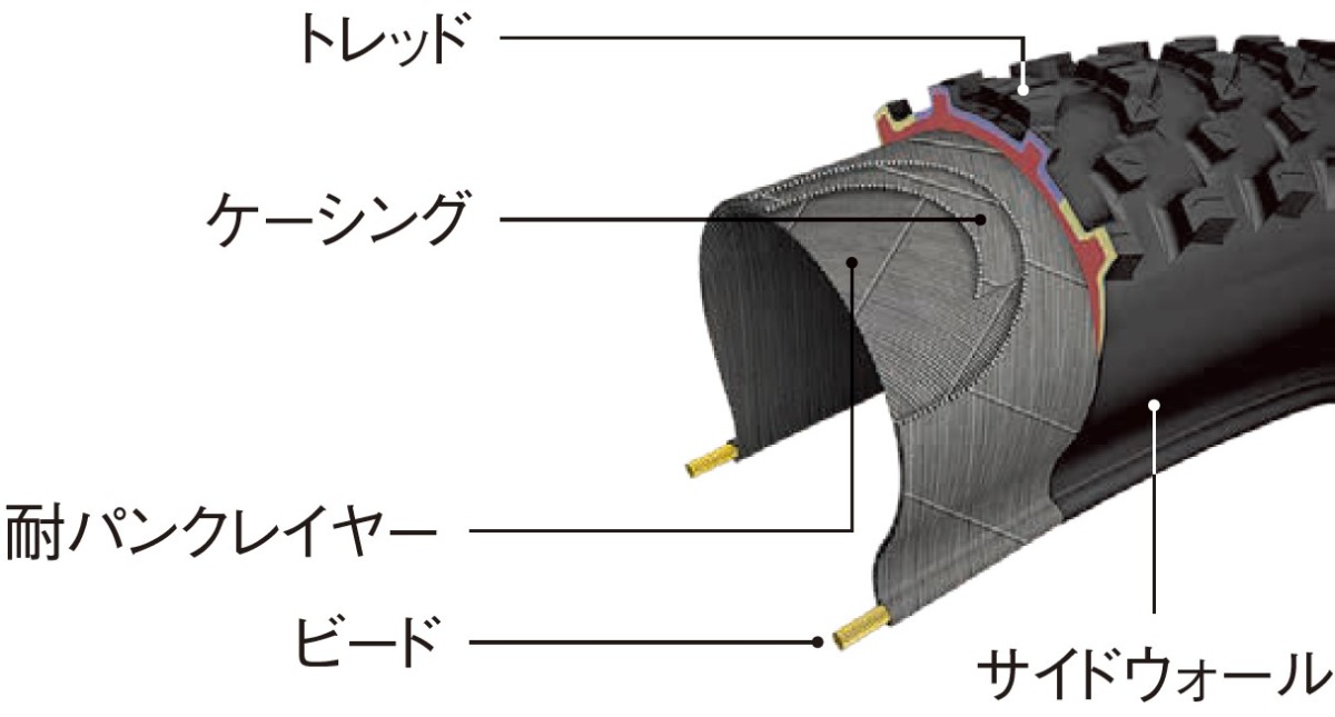 MTBタイヤはケーシングを骨格とし、外側に接地面のトレッドや側部を守るサイドウォールがある。ケーシングの外側にパンクやカットに対応する薄いレイヤーを設ける場合もある。特にマキシスのMTBタイヤのケーシングではナイロン素材をメインに採用し、その密度は60TPI、120TPI、170TPIの3種類。TPIが小さいほど繊維が太く、耐久性が高い。反対にTPIが大きいほど繊維が細く、しなやかな乗り心地に。
