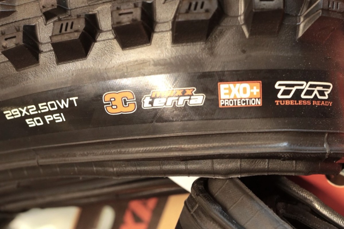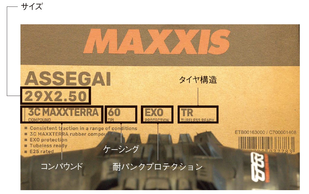 マキシスのタイヤパッケージには、タイヤのサイズ(ホイール径×幅=29インチホイールの2.50インチ幅)、コンパウンドやケーシングの種類、耐パンクプロテクション、タイヤの構造(チューブレスレディかチューブドか)などが記載されている。