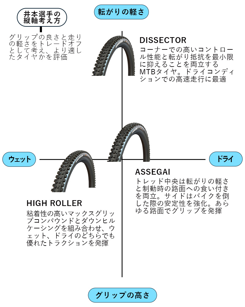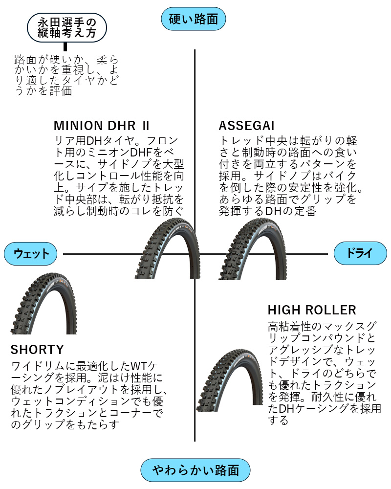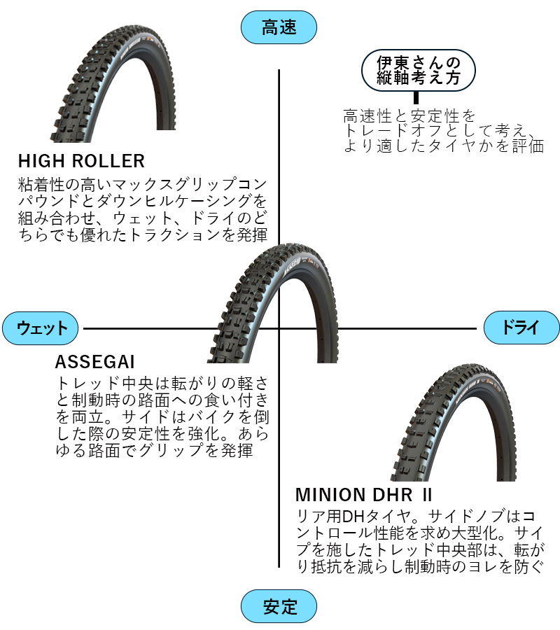 →登り重視:FOREKASTER、REKON、下り重視:AGGRESSOR、MINION DHF、※MINION DHR Ⅱ - エンデューロなら「高いグリップと耐久性、DHと比較しての軽さ」を重視