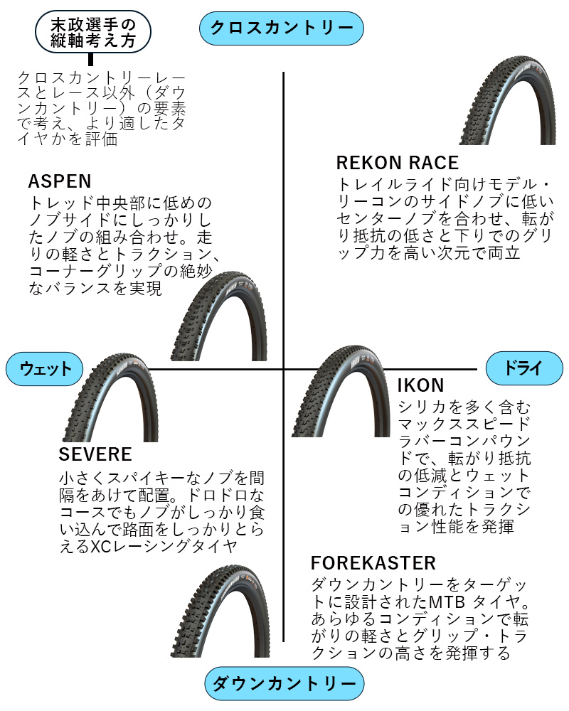 →ASPEN ST、ASPEN、IKON、REKON RACE、SEVEREがオススメ - トレイル/オールマウンテンなら「バランス、適度なグリップ」を重視