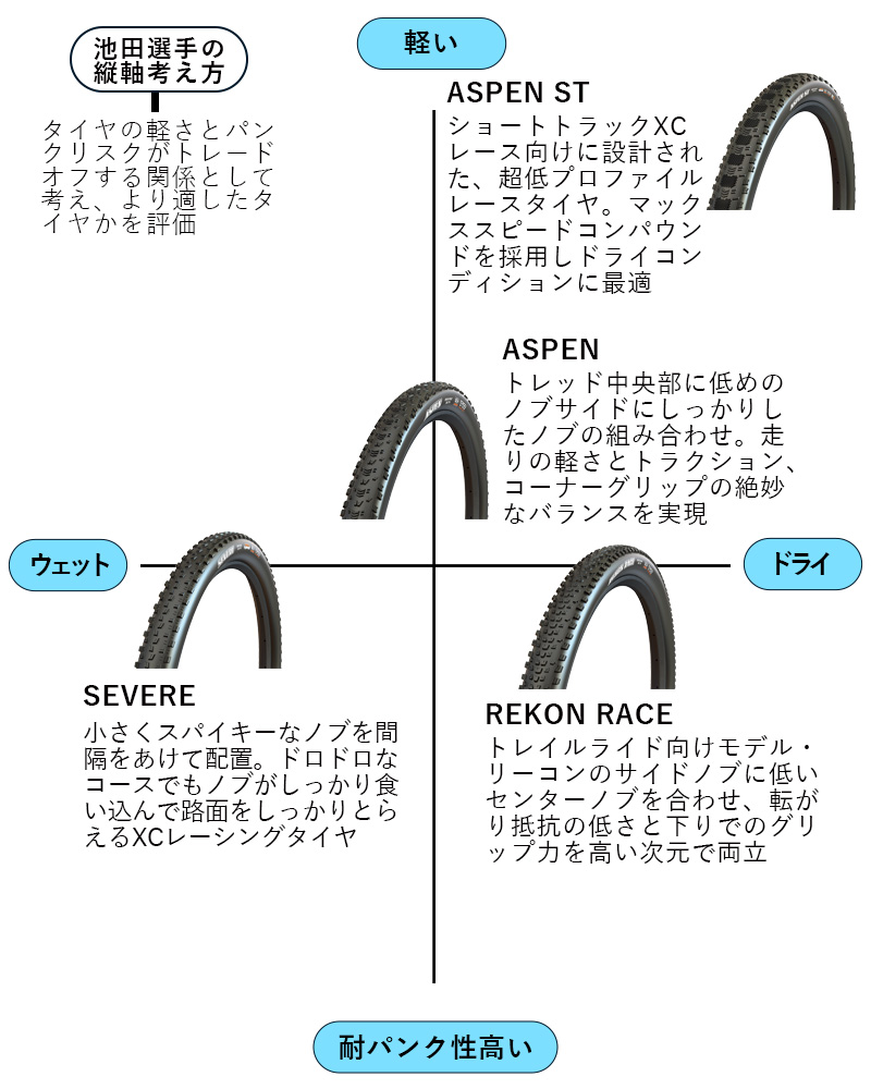 王滝のような長い上りがあるところはASPENの軽さが生かせそうです。ドロドロなコンディションだとSEVEREを使います。日本のコースは粘土質な土が多いのでノブが詰まったタイヤだと泥が詰まりやすいですが、SEVEREはノブの間隔が広くて泥はけがいいんです。