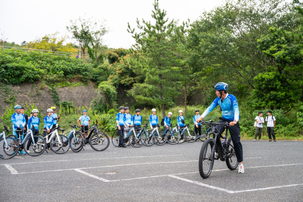 トライアルライドはSANDBOX TOTTORI近くの市営浜坂駐車場を拠点にスタート。株式会社オージーケーカブトの柿山昌範氏による「ヘルメットの正しい被り方」、株式会社コイデル代表・門田基志氏による「Eバイクの乗り方・ンドサイン」講習が行われ、加盟団体メンバーにとってEバイクを学ぶ貴重な機会となった。