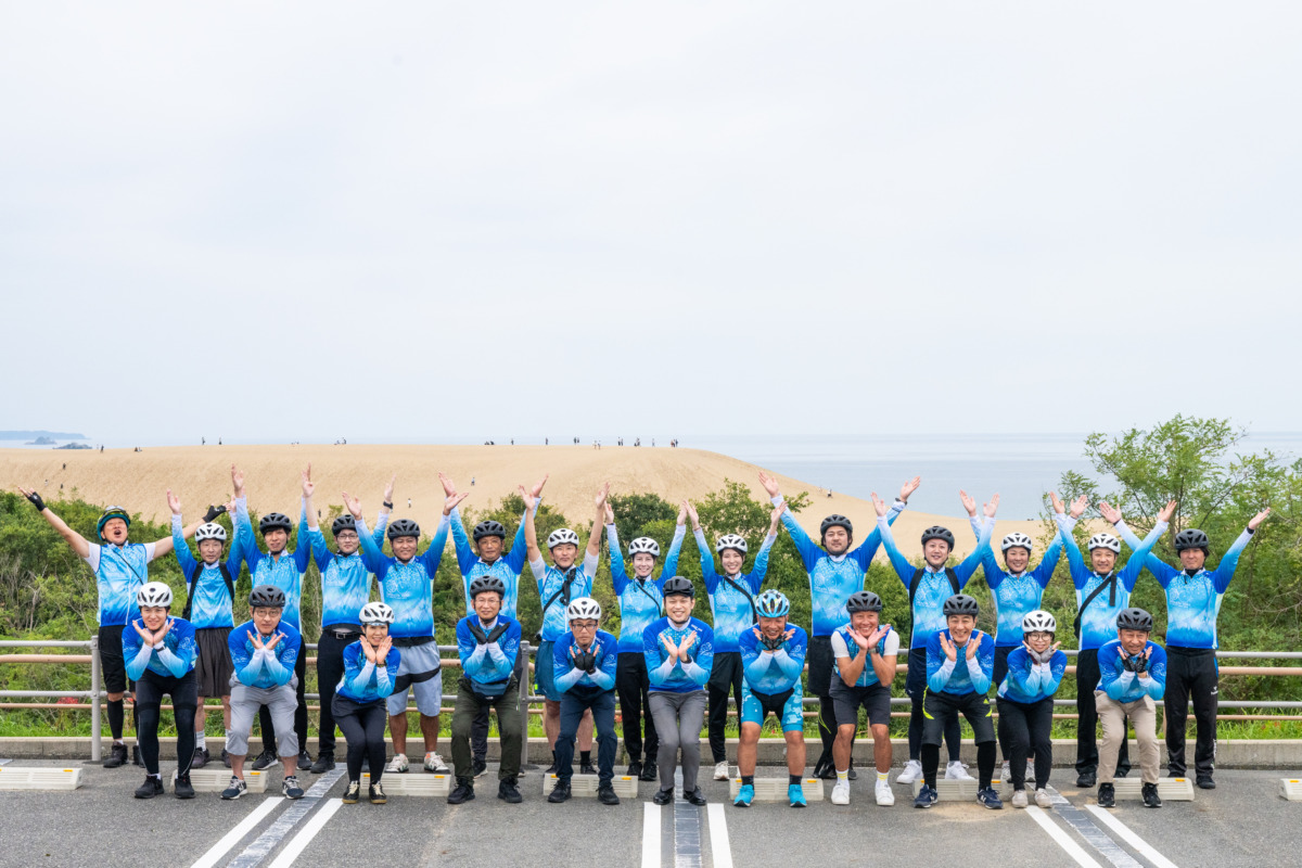 市営浜坂駐車場を出発したメンバーはトライアルライドを体験し、鳥取砂丘前の砂丘を望む駐車場から雄大なその眺めを楽しんだ。さらに進んだ先の「IWADO BASE」ではエイド休憩が設けられ、地元特産の梨ケーキと梨サイダーでリフレッシュした。