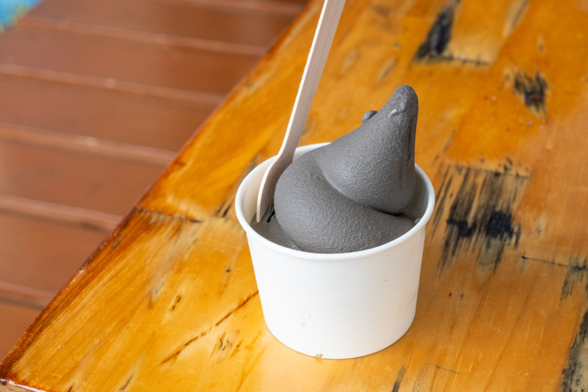 浦富海岸遊覧船乗り場では、珍しいイカスミソフトクリームを試食。その後、「岩美ブルー」として知られる浦富海岸へと向かった。