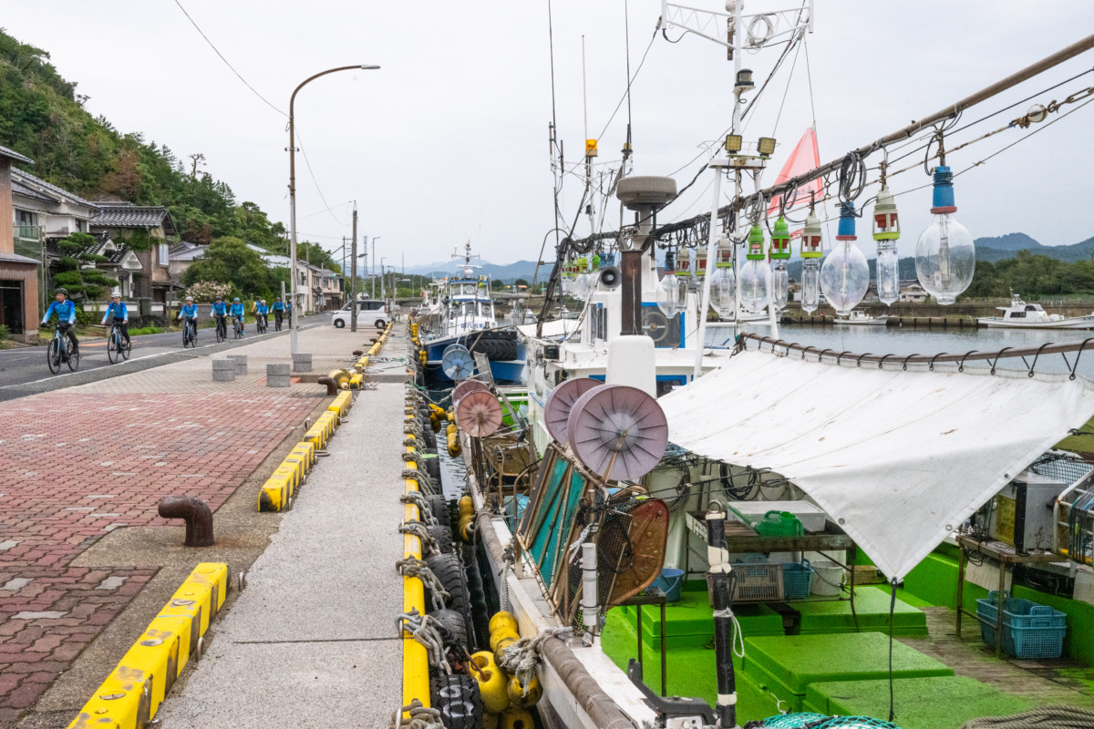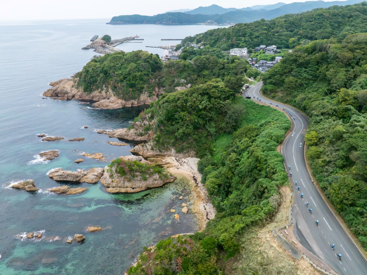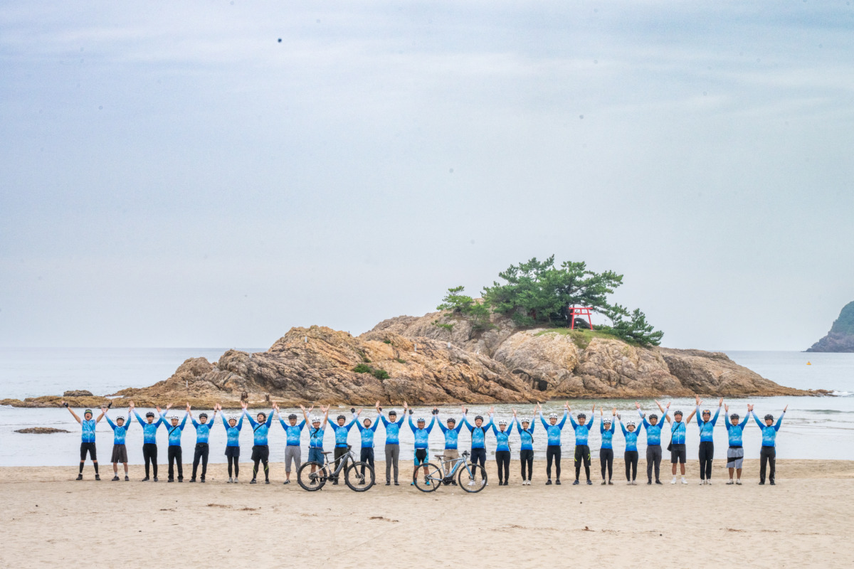 このエリアは青い海と白い断崖が織りなすリアス式海岸の景勝地で、世界ジオパークに認定されている。メンバーは浦富海岸沿いの約5.8kmを走行し、日本海に浮かぶ島々を望みながら絶景の中をサイクリングした。