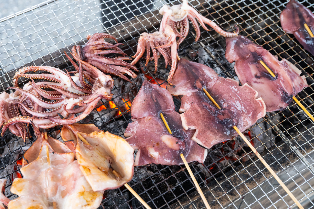 砂浜で記念撮影を行い、ゴール地点の浦富海岸第二駐車場へ到着。駐車場では地元漁師が焼いた新鮮なイカ焼きを味わい、海の幸を堪能した。この一帯はイカ釣りが盛んで、夜には漁り火が水平線を美しく照らす。