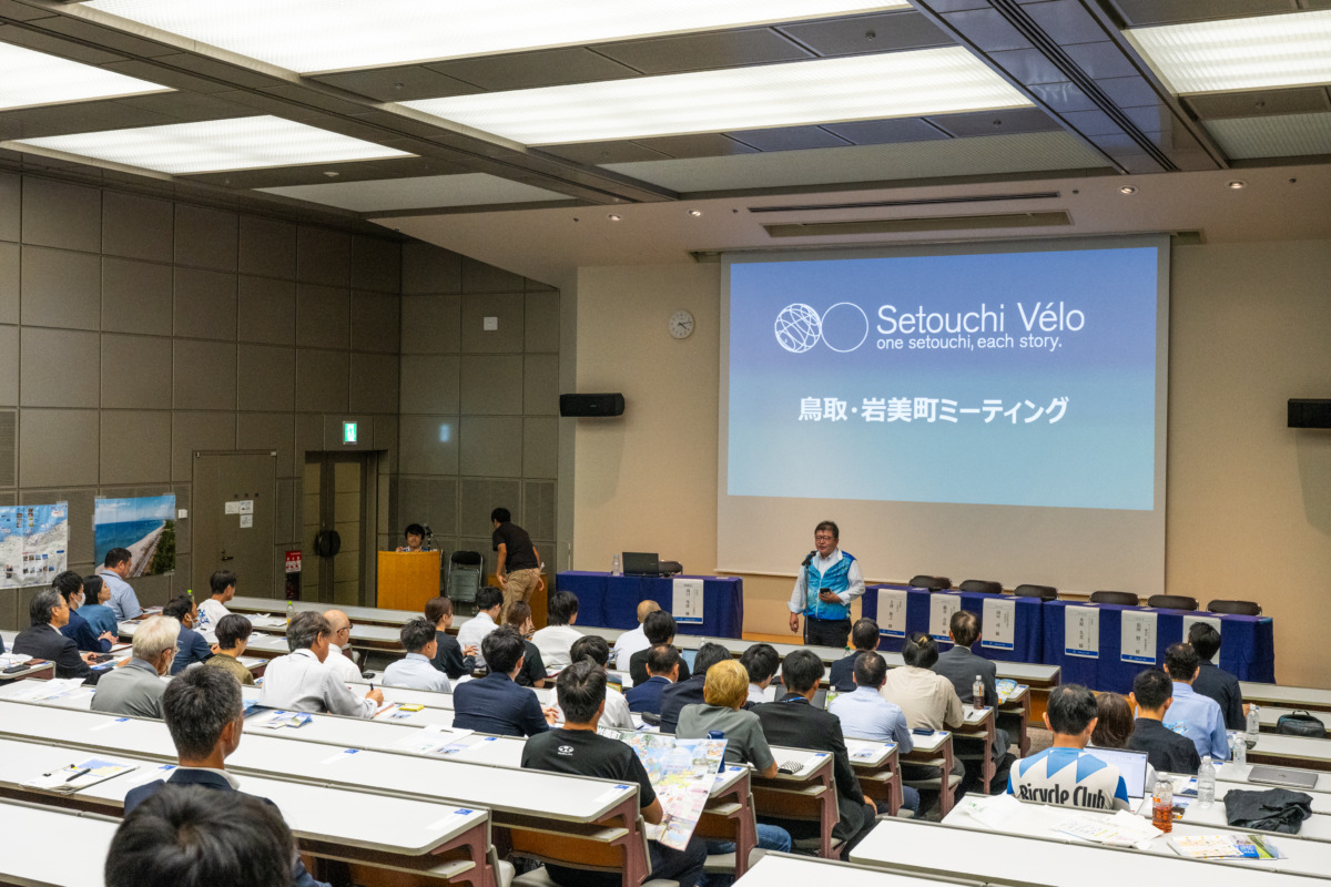 トライアルライドの後、メンバーは鳥取市のとりぎん文化会館へ移動し、Setouchi Vélo協議会ミーティングが開かれた。冒頭では開催地を代表して岩美町副町長の田中祥一氏が挨拶をし、岩美町が自然や温泉、サイクリングなど多彩な地域資源を活かし観光振興を進めていることを紹介した。
