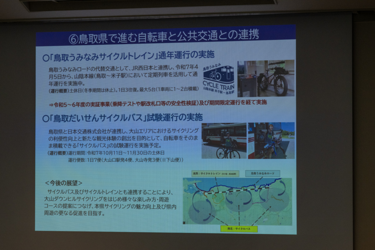 さらに、JR西日本との「鳥取うみなみサイクルトレイン」、大山エリアでの「鳥取だいせんサイクルバス」実証運行など、公共交通との連携による周遊観光促進を報告。韓国・台湾との交流や地域主導のファットバイクツアーなど、地域発の取組も紹介された。