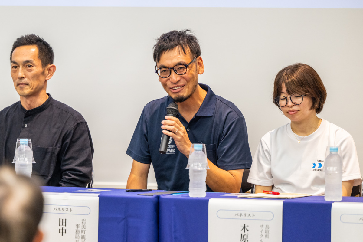 地元を代表して株式会社トリベイ代表取締役社長の縫谷吉彦氏は、鳥取市での「観光シェアサイクル実証事業」について報告し、「移動データ分析により観光回遊性と経済効果を見える化できる」と述べ、岩美町観光協会の田中司事務局長はアニメロケ参考地巡りに合わせたサイクリングの人気を紹介し、ライト層の拡大を実感しているとつづけた。また、鳥取県サイクルツーリズム振興室の木原久美室長は「行政は主導ではなく、地域や民間の挑戦を支援する立場」と語り、矢羽根整備や交通安全教育による理解促進の取組を紹介した。