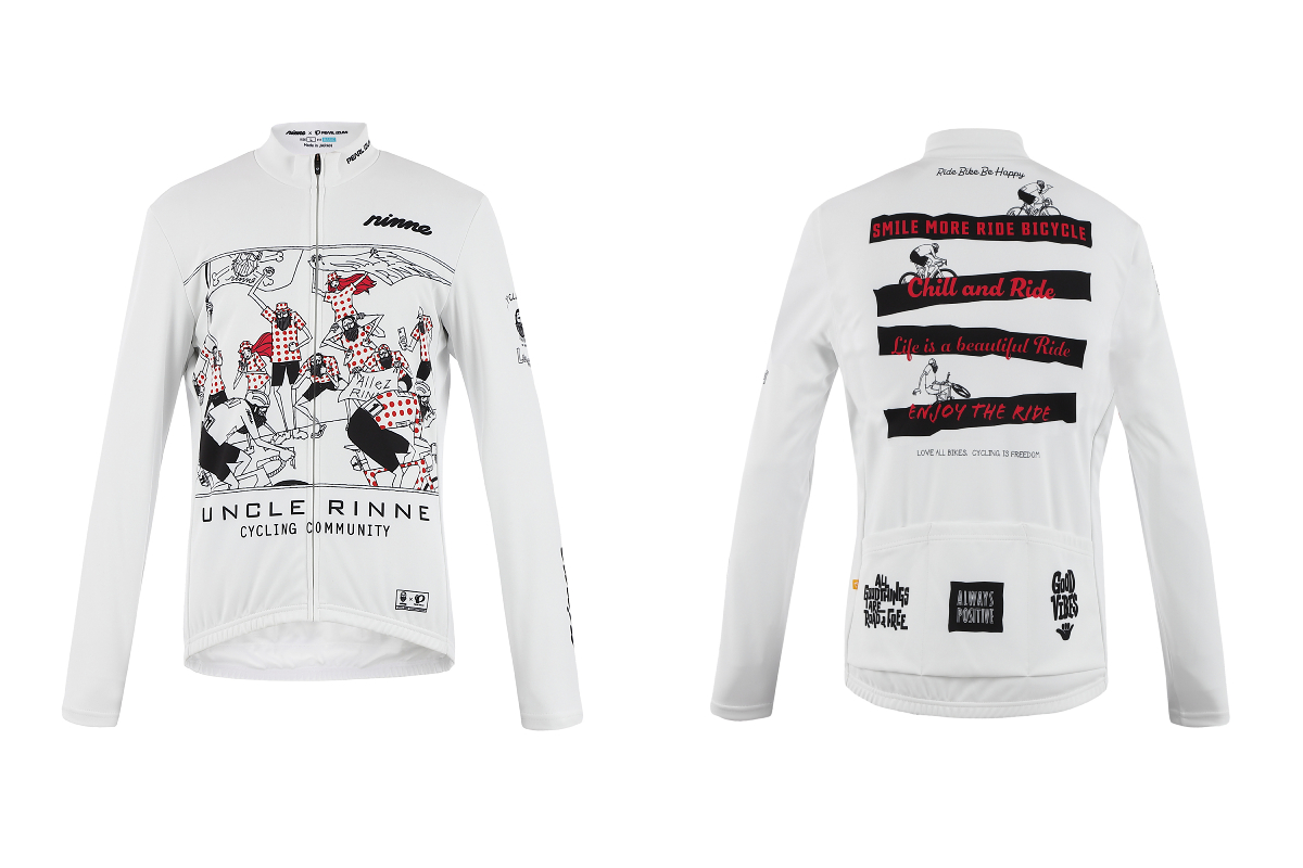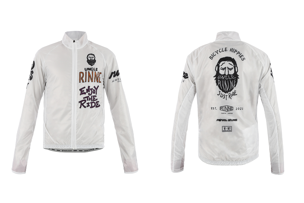 ライド中の体温調節や、急な天候の変化に対応するための防寒対策に便利な、薄手で軽量なウィンドブレーカー。背中には「アンクル・リンネ」が大きく描かれた、インパクトのあるデザインが施されている。