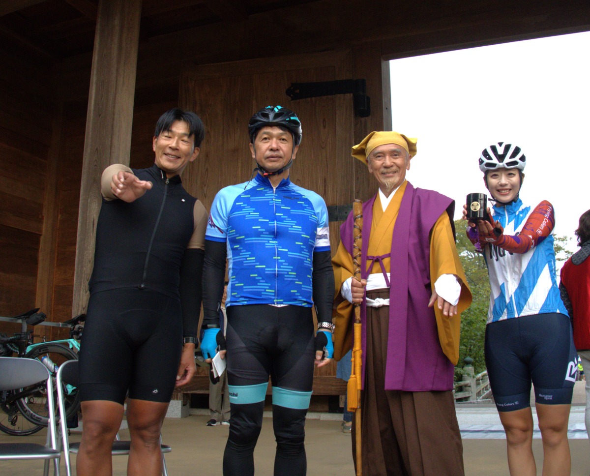 朝6時過ぎ、まだ冷気の残る水戸城大手門前で開催されたスタートセレモニーが開催。茨城県知事の大井川和彦さん挨拶ではじまり、ゲストライダーの水戸ホーリーホックCRO(クラブ・リレーションズ・オフィサー)本間幸司さん、ロードレース元日本チャンピオン佐野淳也さんが登壇。地元への熱いメッセージとともに、出走の号令を送った。