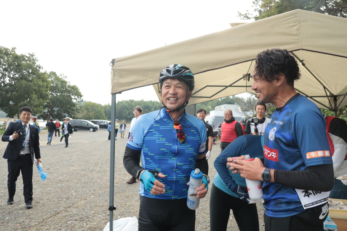 2つ目の補給所、美和地域センターでは炊きたての湯気が出迎えます。ここで味わえるのは、釜炊き やおとや「直巻きおむすび」と、まるしんドライブイン「けんちんそば」。さらに地元・那珂市産のコシヒカリを使ったおむすびは、米の旨みがぎゅっと詰まり、さらにけんちんそばは「ゆずの香りがよく、具がたっぷりで美味しかったです」と妖怪つけまつげさん。このあとは大子までのヒルクライム、タバッコ峠とアップルラインの2つのきもっちがいい坂を越えていく。「前半はエイドを楽しみながら、それぞれのペースで走れるのが楽しかったですね。じつはレース以外で県外の自転車イベントを走るのは初めてで、各エイドで美味しいものを食べられたのはうれしかったです」とグループライドを楽しんでいた。