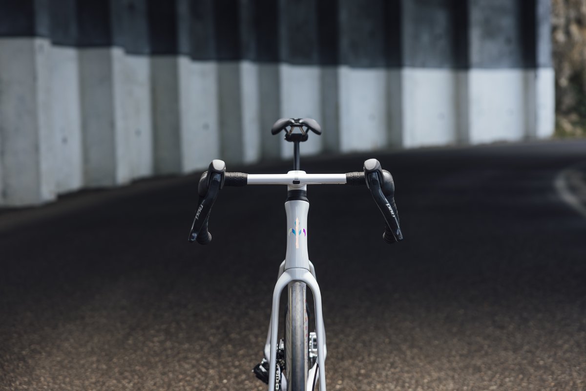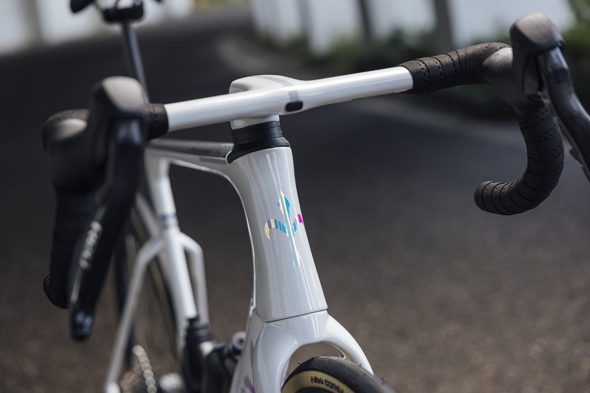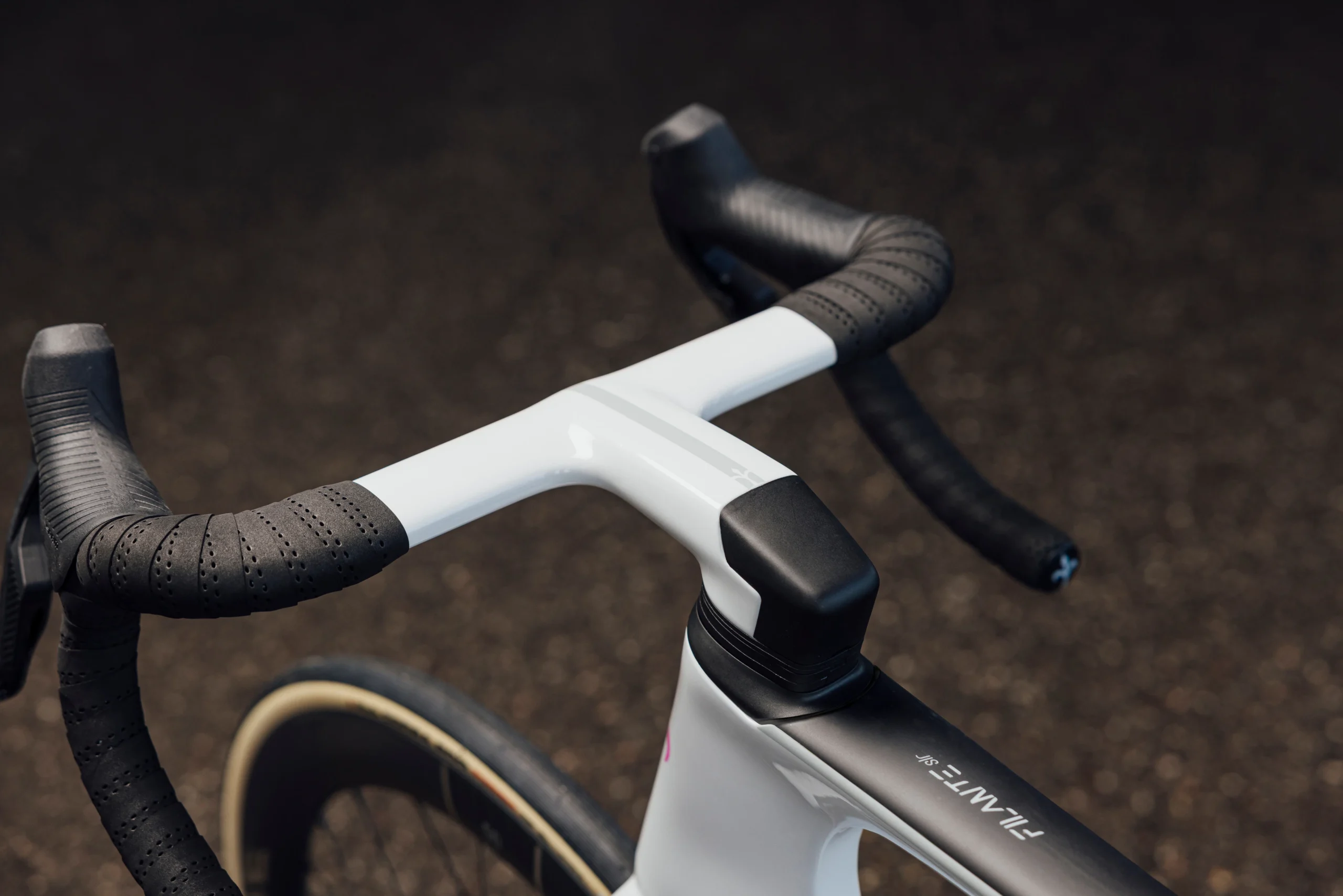 コックピットには、ワールドツアーチーム、グルパマ・FDJとの共同開発で生まれた新型のステム一体型エアロハンドル「F-Bar ID2」を採用。ブラケット部がドロップ部よりも3cm狭い「O.E.F. (Optimized Ergonomic Flare)」コンセプトを取り入れ、エアロポジションの維持と、下ハンドルを握った際のコントロール性を両立。ステムの固定ボルトを完全に隠す、ウィリエール初となるエアロカバーも採用し、細部までエアロを突き詰めている。