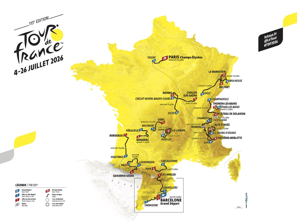 世界最大のサイクルロードレース、ツール・ド・フランスの2026年大会コースプレゼンテーションがフランス・パリにて行われた。現地10月23日に行われたイベントでは、トップ選手をはじめとする多くの招待客の前で3週間に及ぶコースの大枠が明らかに。かねてから発表されていたスペイン・バルセロナ開幕に加えて、ピレネー山脈、中央山塊、ヴォージュ山脈、アルプス山脈へと進んでいくルートが決定。驚きは、名峰ラルプ・デュエズの2日連続登頂だ。