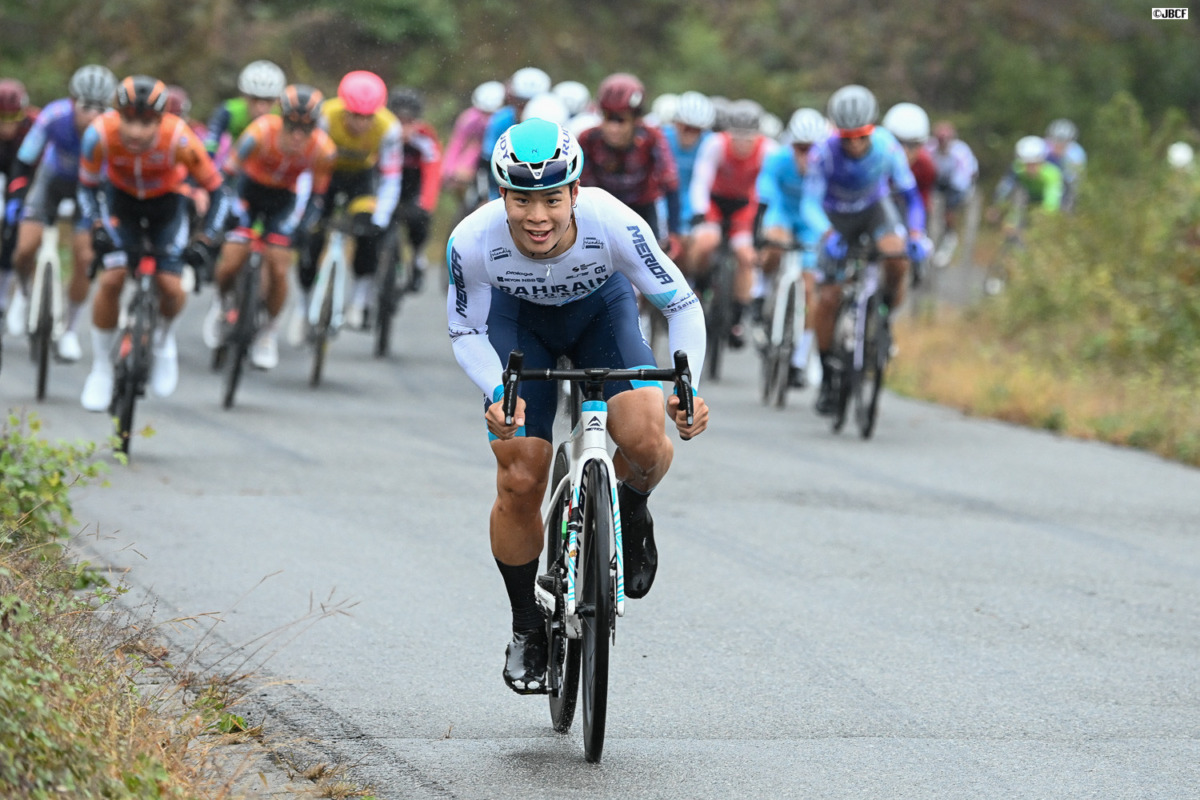 レースが再び大きく動いたのは、残り10周を切ったところ。メイン集団から、オープン参加の寺田吉騎(バーレーン・ヴィクトリアスデベロップメントチーム)が単独で追走を開始。この動きをきっかけに集団が一気に活性化し、逃げ集団との差を急速に縮めていく。