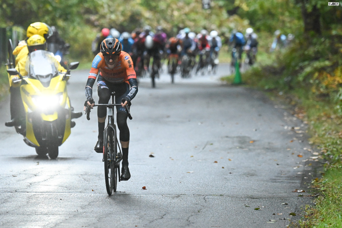 そして残り7周、先行していた7名を吸収すると、間髪入れずにヴィクトワール広島のベンジャミン・ダイボールがカウンターアタック。瞬く間に後続を引き離し、単独での逃げ切り態勢を築いた。一時は後続に1分以上の大差をつけ、その独走力を見せつける。