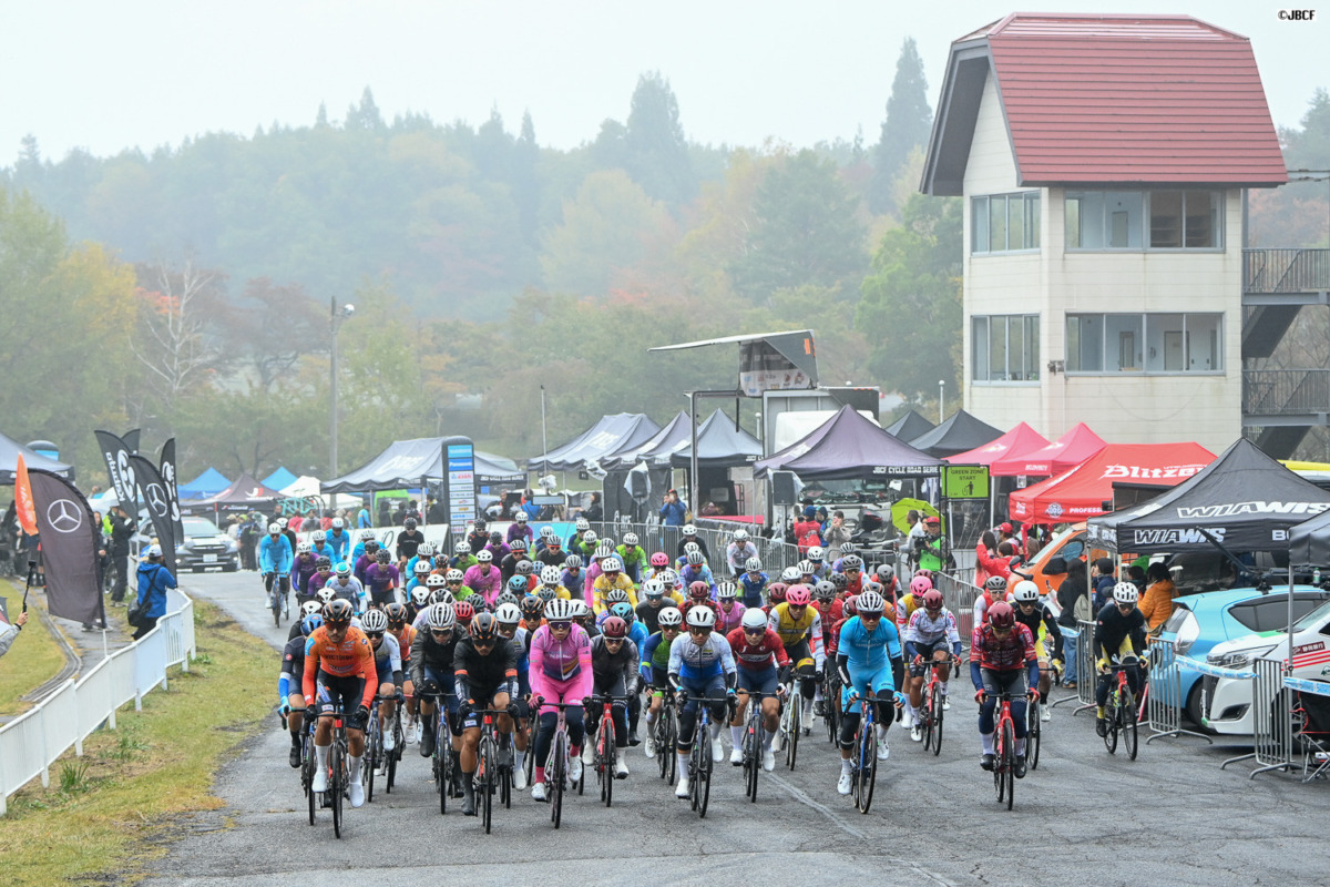 朝から降り続く弱い雨と、気温10℃という厳しいコンディションの中、2025年シーズンの最終決戦は幕を開けた。6kmのサーキットを25周する150kmの長丁場は、スタート直後からアタック合戦が勃発。1周8分台という、このコンディションでは異例とも言えるハイペースで周回が進んでいく。