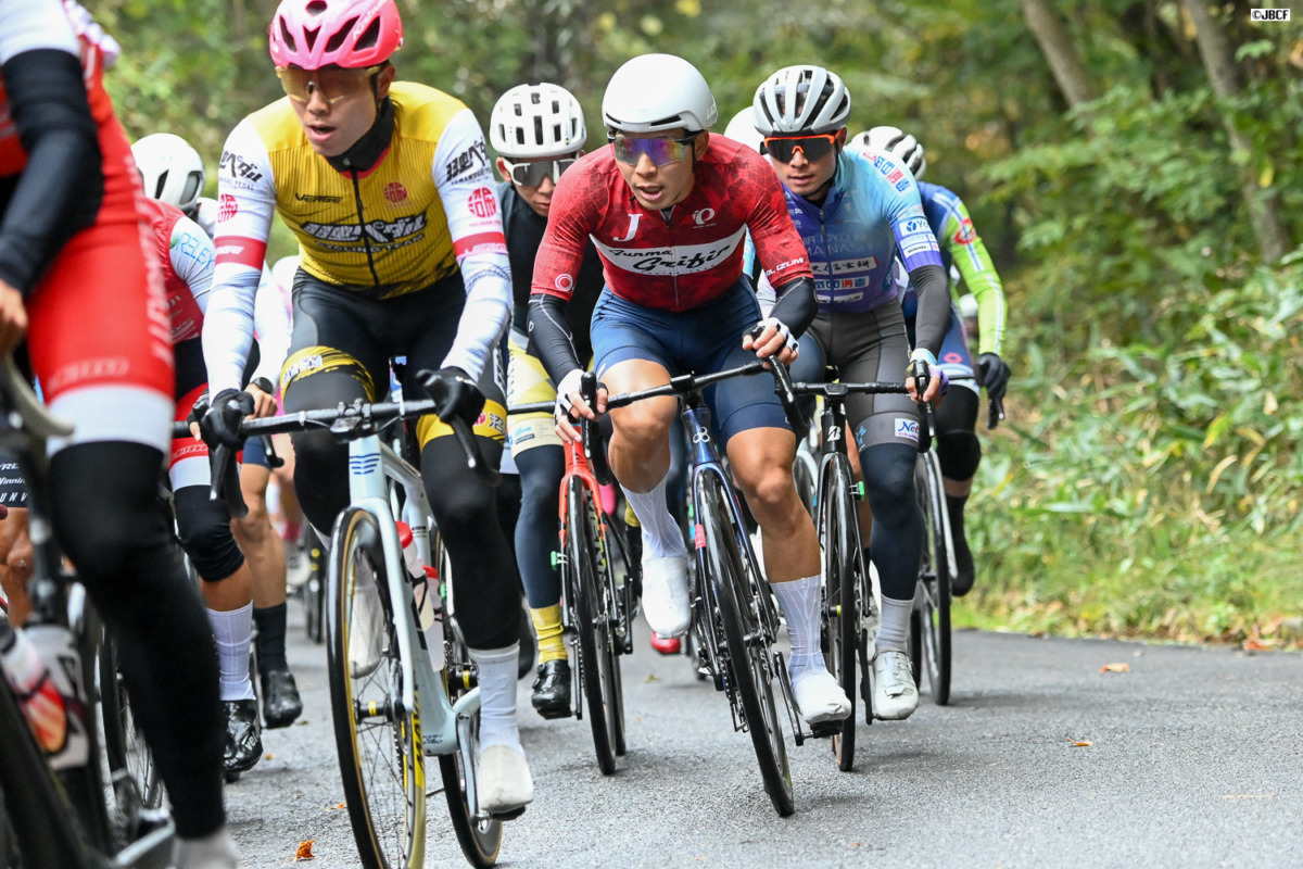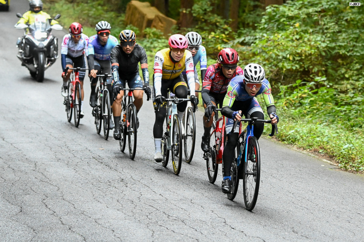 年間個人総合優勝のかかる金子と、逆転を狙う岡。二人の動向に注目が集まる中、7周目にレースが動く。孫崎大樹(ヴィクトワール広島)武山晃輔フォン・チュンカイ(Astemo宇都宮ブリッツェン)、馬場慶三郎(弱虫ペダルサイクリングチーム)、小出樹(イナーメ信濃山形)、菅原聡と山里一心(アヴニールサイクリング山梨)という7名の強力な逃げ集団が形成された。宇都宮ブリッツェンが2名を送り込む有利な展開だ。