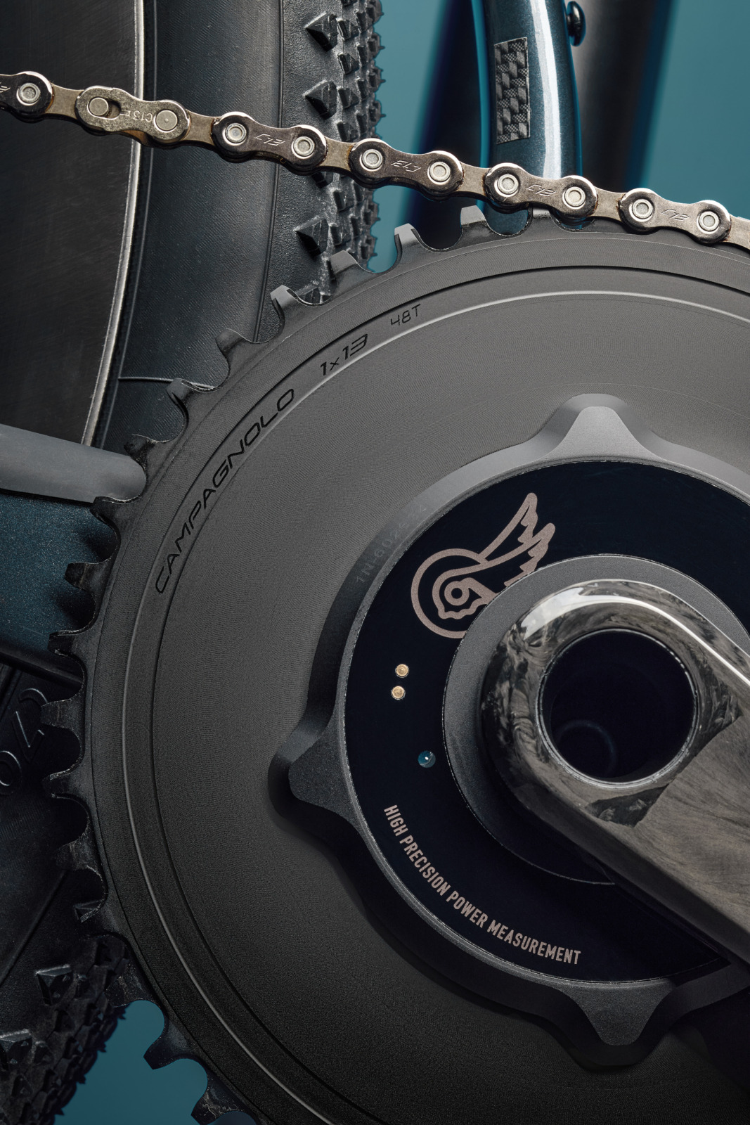 クランクアームは、露出したカーボンが美しいカンパニョーロ伝統のデザイン。Qファクターは152mm、チェーンラインは47.5mmと、ワイドなタイヤクリアランスを確保する現代のグラベルフレームに最適化されている。もちろん、16個のセンサーで高精度なパワー計測を実現する「HPPM」パワーメーター内蔵モデルも用意される。