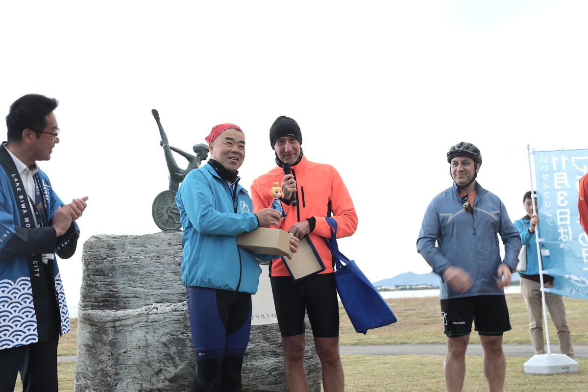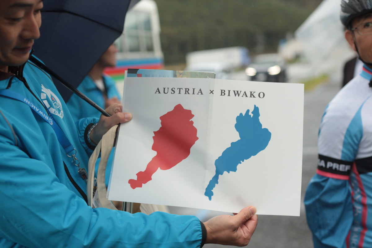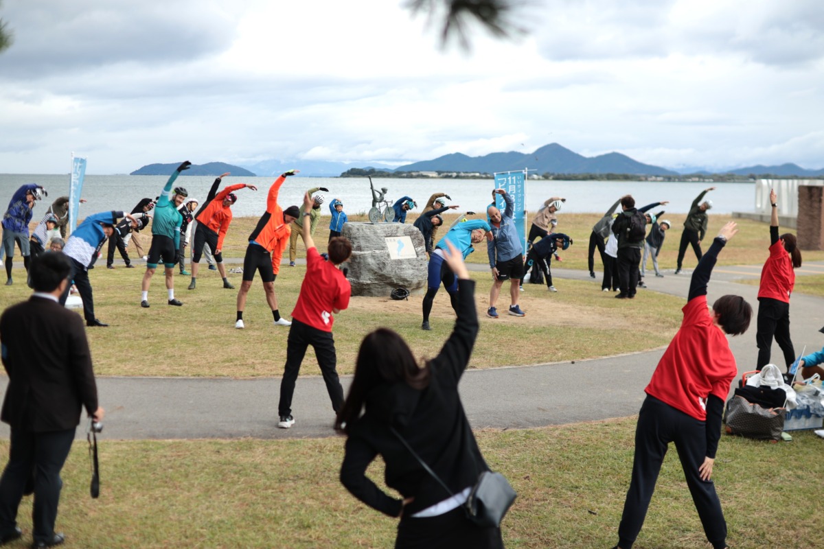 午前9時、琵琶湖岸にある守山市第2なぎさ公園にサイクリストが集まり、開会式が行われた。セレモニーでは三日月大造知事、駐日EU代表部のパケ大使、守山市の森中高史市長の挨拶のほか、パケ大使から三日月知事へ記念品の贈呈が行なわれた。