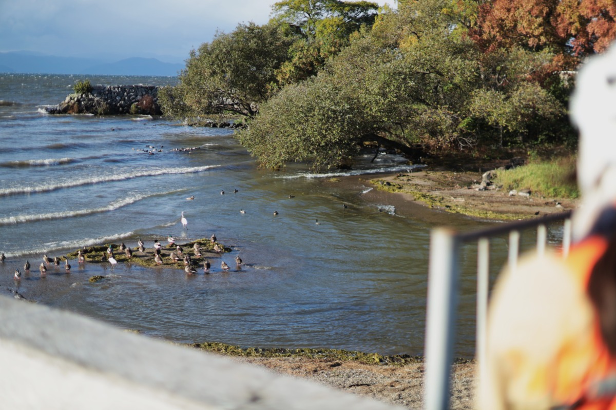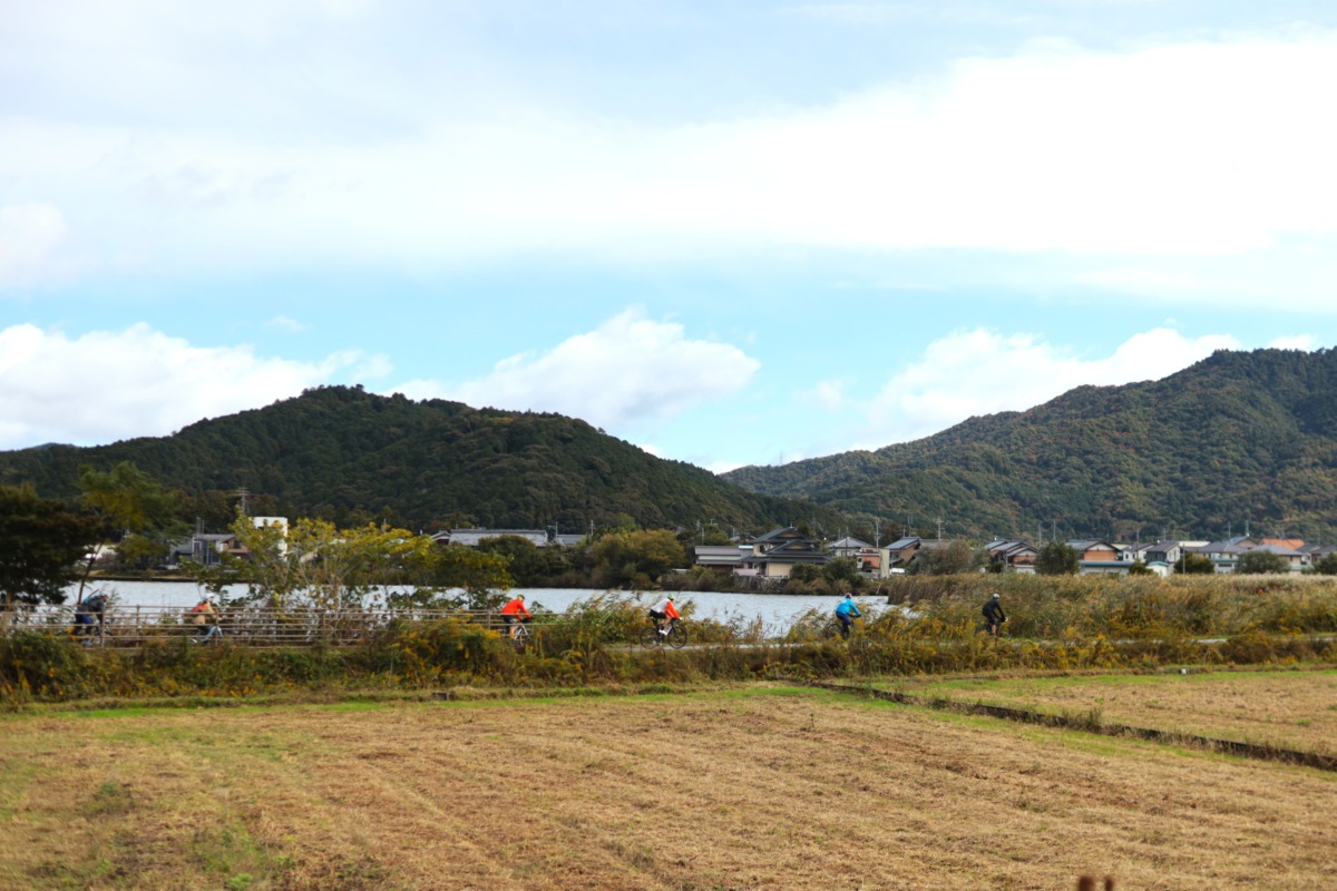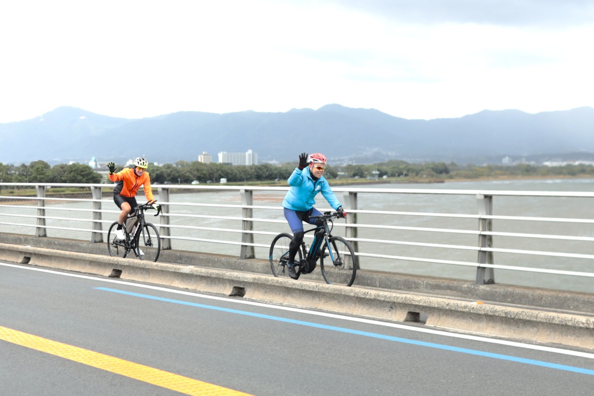 三日月知事一行は守山市の第2なぎさ公園をスタートしてから湖岸を北上し、近江八幡市の渡合橋で小休止。そしてオーストリア・ブルゲンラント州との交流を象徴する「ブルゲンラント・ロード」をライドした。