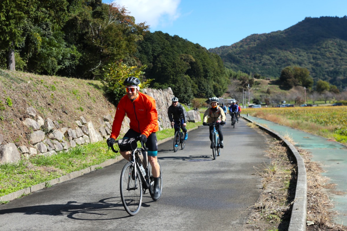 食事の後は、三日月知事に代わり岸本副知事がライドに参加し、パケ大使らと軽快に走っていく。そして彦根市にある湖岸緑地南三ツ谷公園で休憩。11月8日(土)、9日(日)の2日間、ビワイチルート上に設置された「エイドステーション」と同じ、協賛企業提供の補給食が提供された。