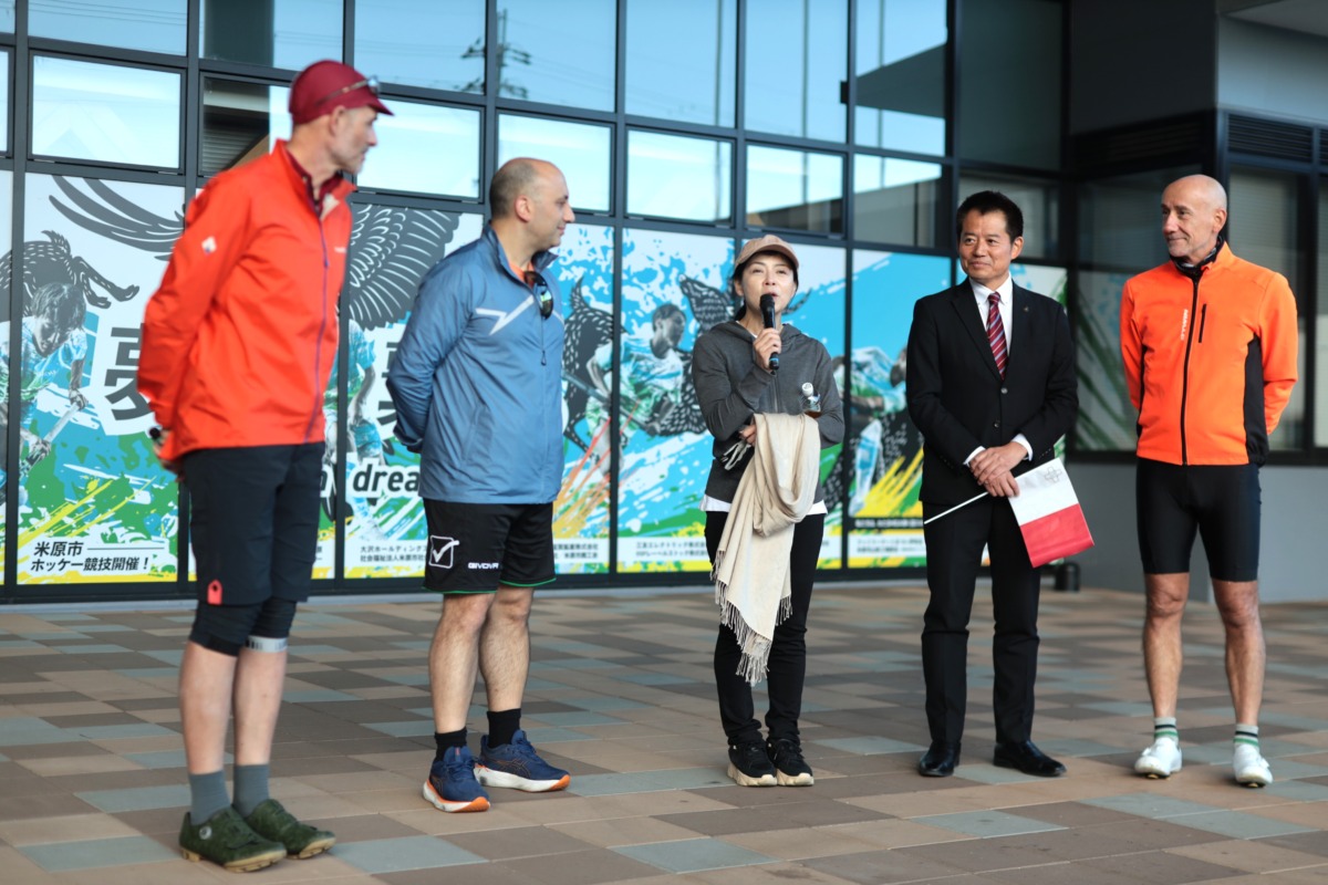 米原市役所に到着し約60kmの行程を完走した一行。ここで角田航也米原市長はじめ、市のスタッフが温かく出迎えた。
