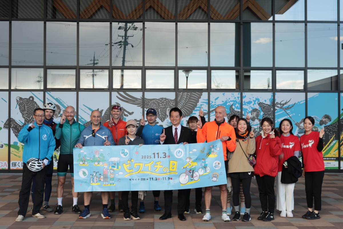 11月3日は「ビワイチの日」ということで、滋賀県内で「ビワイチの日2025」記念ライドが開催された。「ビワイチの日」はナショナルサイクルルート「ビワイチ(琵琶湖一周サイクリング)」の魅力を国内外に発信する目的で毎年実施されているが、今年は初めて海外要人を招き、国際的な交流をテーマにした特別な一日となった。招待されたのは駐日EU代表部のジャン=エリック・パケ大使、駐日マルタ共和国のアンドレ・スピテリ大使、ホストとして滋賀県の三日月大造知事、岸本織江副知事が参加し、地元のツアーガイドやサイクリストなど約30名と共に、守山から米原までの約60kmのライドを楽しんだ。