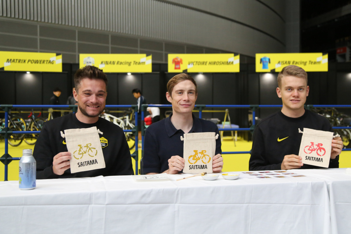 加えて、海外招聘選手はさまざまなプログラムに参加。Zwift(ズイフト)で一般参加者と勝負したり、グッズ販売ブースに選手がサプライズ訪問するなど、入場者との触れ合いを笑顔で楽しむ姿も。チーム ヴィスマ・リースアバイク、レッドブル・ボーラ・ハンスグローエの両チームは手描き友禅を体験。日本の伝統文化に触れ合い、笑顔を見せた。