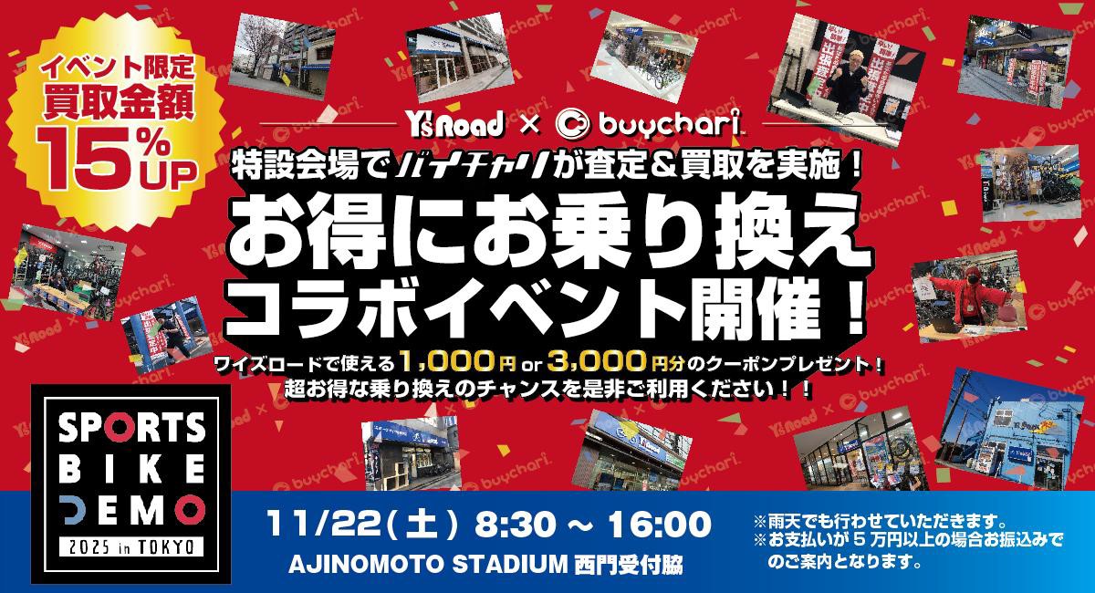 自転車リユース業界をリードするbuychariが、今年もスポーツバイクデモに出展。当日は会場入口(味の素スタジアム西門)に特設ブースを設け、お客様の自転車・パーツ・用品の買取りを実施する。買取りが成立した場合は、イベント期間限定で買取金額を15%アップするほか、ワイズロードで使えるクーポンもプレゼント。見積もりだけでも大歓迎なので、気軽に相談してみよう。※当日は買取りのみの実施で、中古品の販売はしない