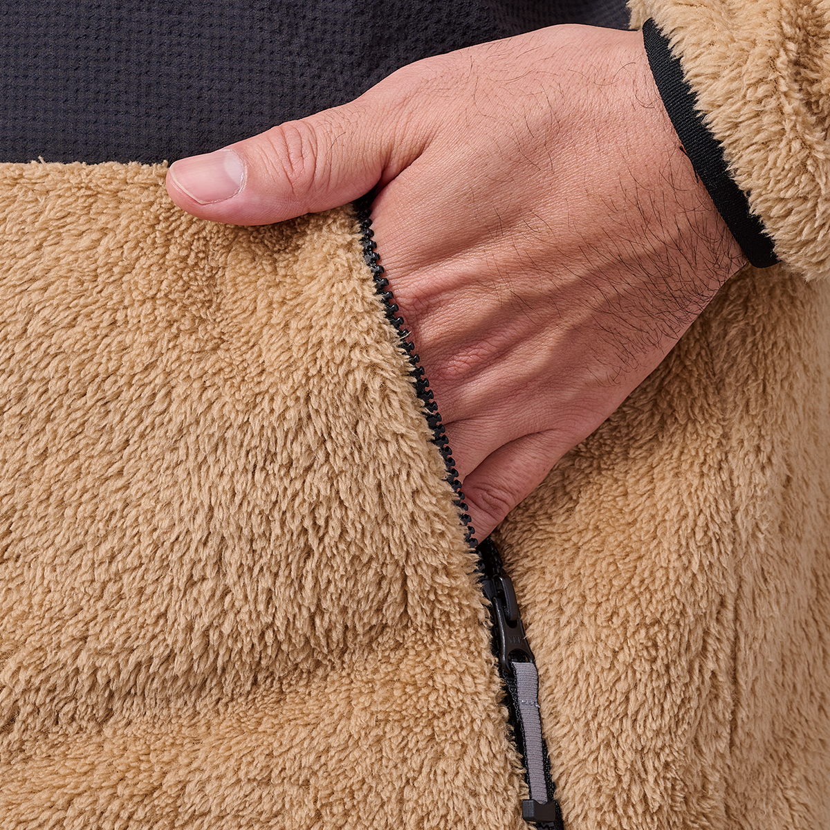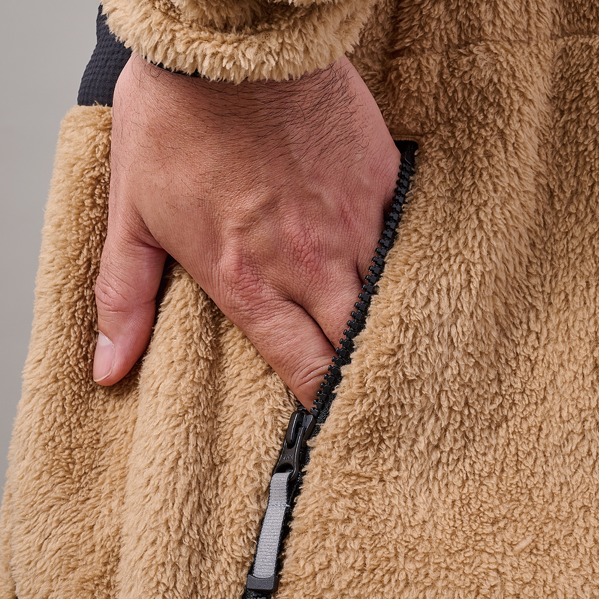 ボアフリースと防風素材を組み合わせた、暖かく動きやすいハイブリッド構造