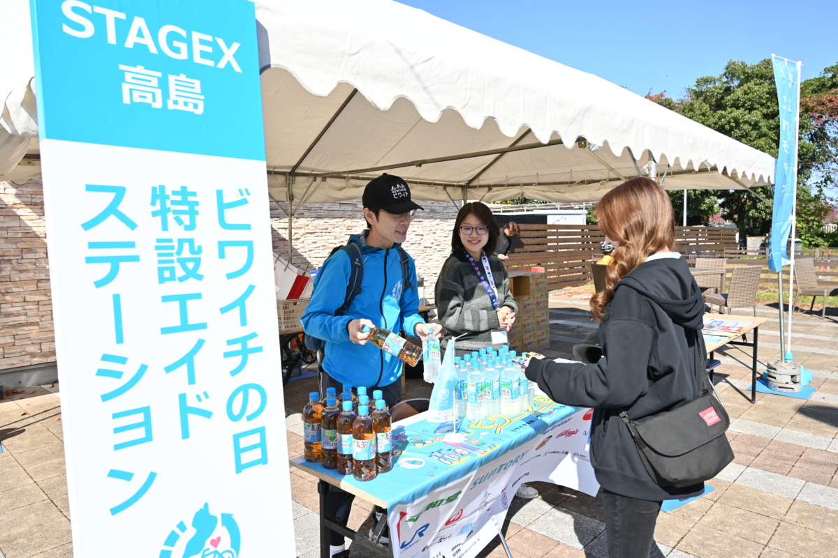 新旭駅から最初の目的地「STAGEX(ステージクス)高島」までは、交通量もほどよく、道もほぼフラット。肩の力を抜いてスイスイ走れちゃいます。この日はお天気も最高で、しかもビワイチの周遊イベント中。エイドステーションが開いていたこともあって、サイクリストが次々立ち寄っていていい雰囲気でした。