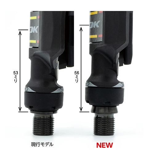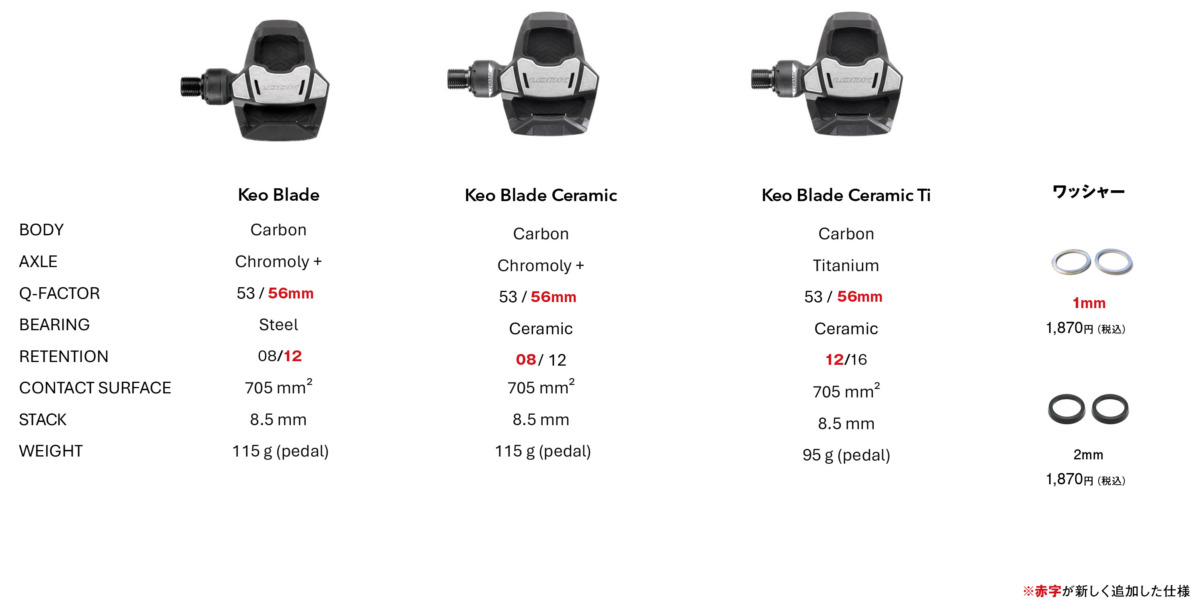 これまでのKEO BLADEシリーズの標準Qファクターは53mmだったが、新たに軸長の長い「56mmモデル」が登場した。さらに、ペダル軸とクランクの間に挟むことで調整を行う専用スペーサー(1mmおよび2mmワッシャー)も新たにラインアップされる。