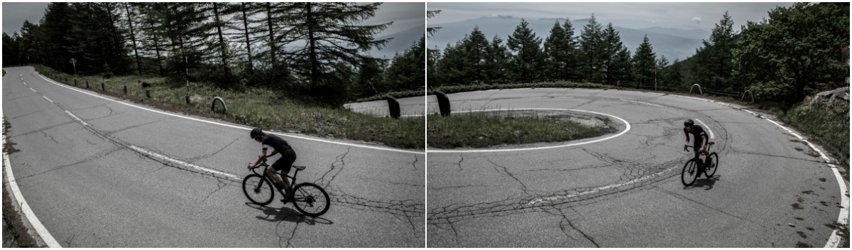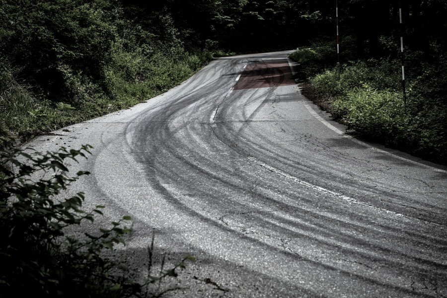 もしかしたら、人の営みをこの峠に見つけることができるのはサイクリストだけかもしれない。平均勾配8%で10km以上続く急登を、ほとんど止まりそうな自転車の速度で走っていると、路面に幾筋も走る黒い線が視界に入ってくる。コーナーを蛇行するように流れるこの黒い線は、主にクルマがつけたものだろう。道路に定着したその入れ墨の上を走ると、タイヤの匂いがむせ返ってくるようだ。決して美しい曲線とは言えないが、無機的な峠道の途上にあって、その痕跡はこの峠に人の感情を伴う往来があったことを示してくれる。車坂峠という名前の登坂を象徴するものは、クルマのタイヤ痕であることもどこか寓話的だ。