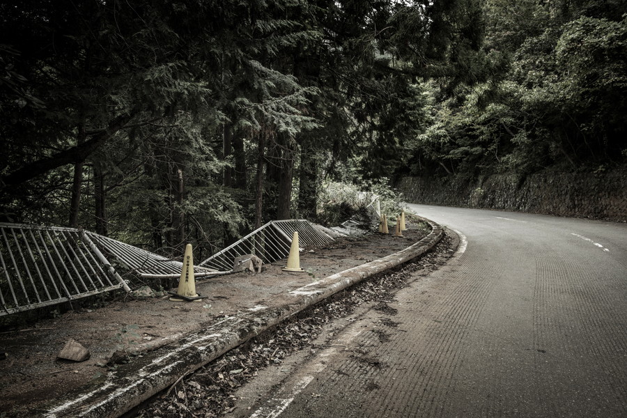 蓑毛はかつて東に位置する大山への参拝路として栄えた過去を持ち、この鳥居はその大山信仰の名残でもある。程なくして、人家はなくなり林道を通る。ここに至ると、歩道には雑草が生い茂り、土砂崩れにひん曲げられたガードレール、土砂の染み込んだ赤茶けた路面と、人里を離れて異界に来てしまったと錯覚するほど。休日ならば息を切らしペダルを踏む数奇者(私であり、あなただ)が前後にいるかもしれないが、平日の朝などは先ほどまでいた秦野市街の喧騒がまるでうそのように静まり返っている。
