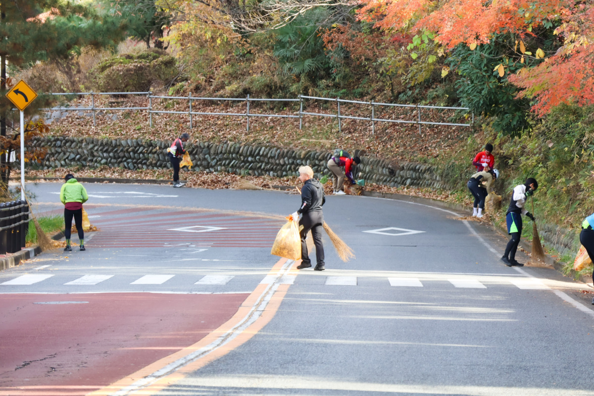 いろは坂清掃は、落ち葉によるスリップの危険を減らすこと、そして日頃走らせてもらっている坂や地域に感謝を伝えることを目的に、長年継続されてきた活動だ。