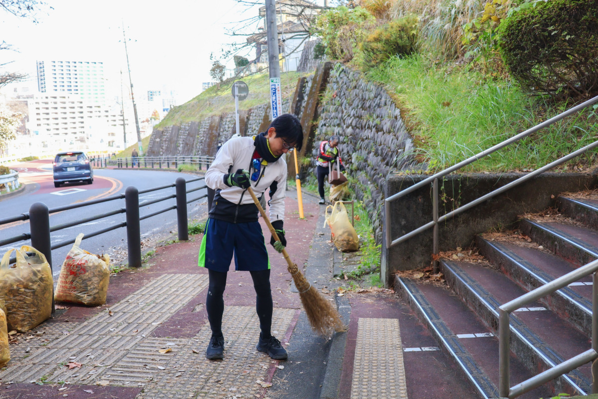 交通量のある坂道での作業ということもあり、参加者は声を掛け合いながら慎重に進行した。掃き掃除、落ち葉の収集、運搬などを分担し、作業は手際よく進んだ。