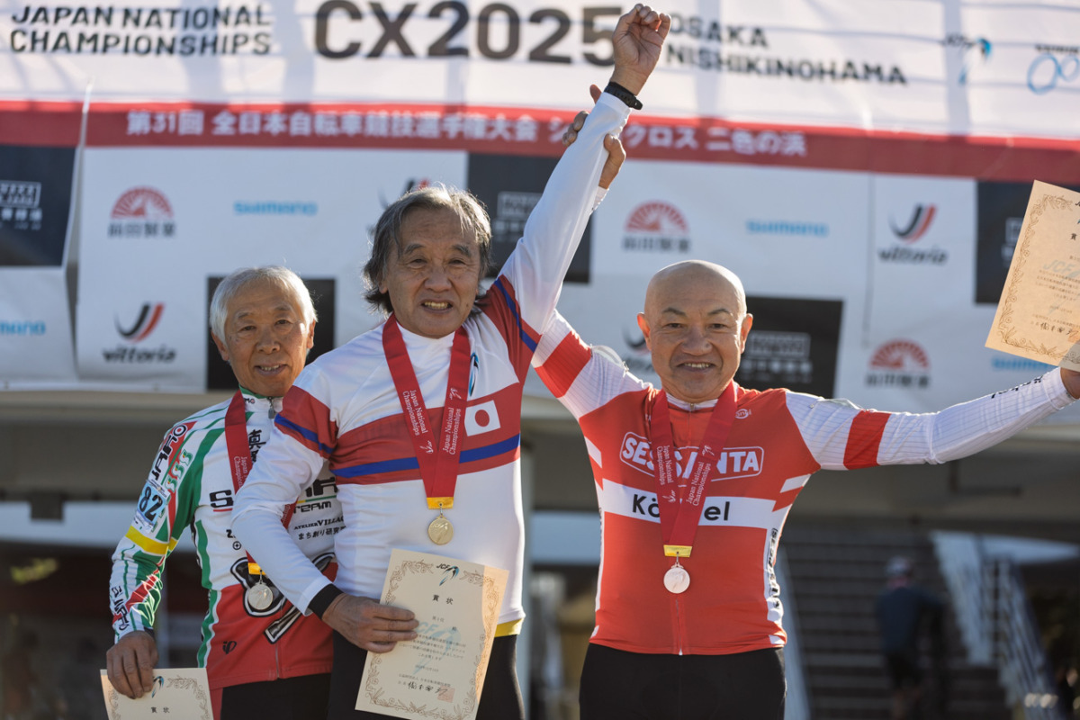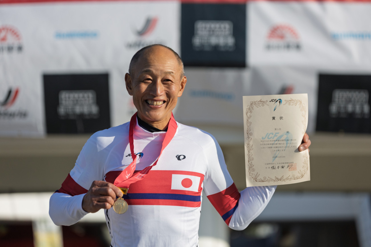 60代以上のカテゴリーでも熱い走りが光った。MM60-64は大原満(Aisan Cycling Club)が2位に1分以上の差をつけて圧勝。MM65-69では、今季マスターズ世界選手権2位の実績を持つ増田謙一(SHIDO-WORKS)が、プレッシャーを跳ね除け優勝を果たした。