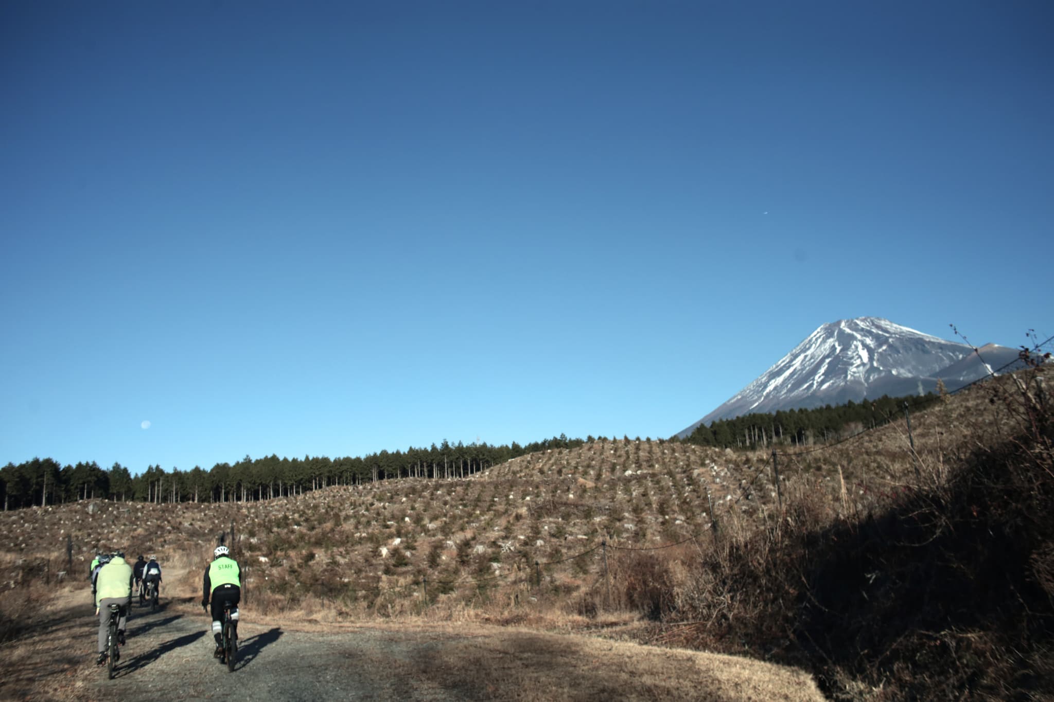 最初のスタートは富士山を背景に、主催者・田渕君幸さんの声援で温かく見送られる。こどもの国を出発してグラベルロードへ入ると同時に、いきなり富士山が正面に見えるフォトスポットが待っている。主催者もきちんとサインボードを用意してくれており、ここで止まらない手はない。グループで記念撮影をした。